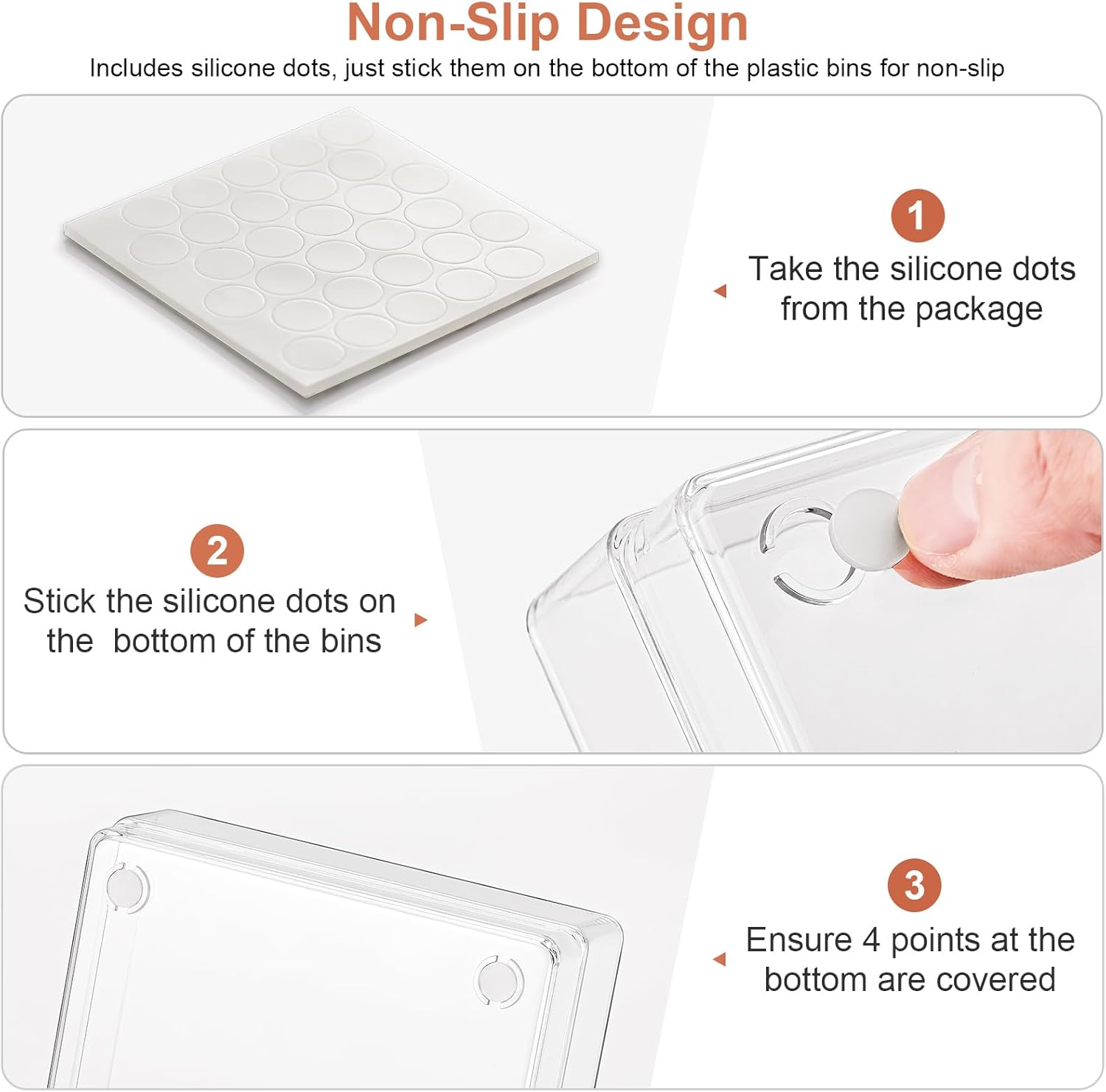 - Non-Slip Design: Includes silicone dots, just stick them on the bottom of the plastic bins for non-slip. Non-slip pads on the bottom of the plastic drawer organizer prevent the box from moving freely while dragging the drawer. Keep your drawers tidy and neat.