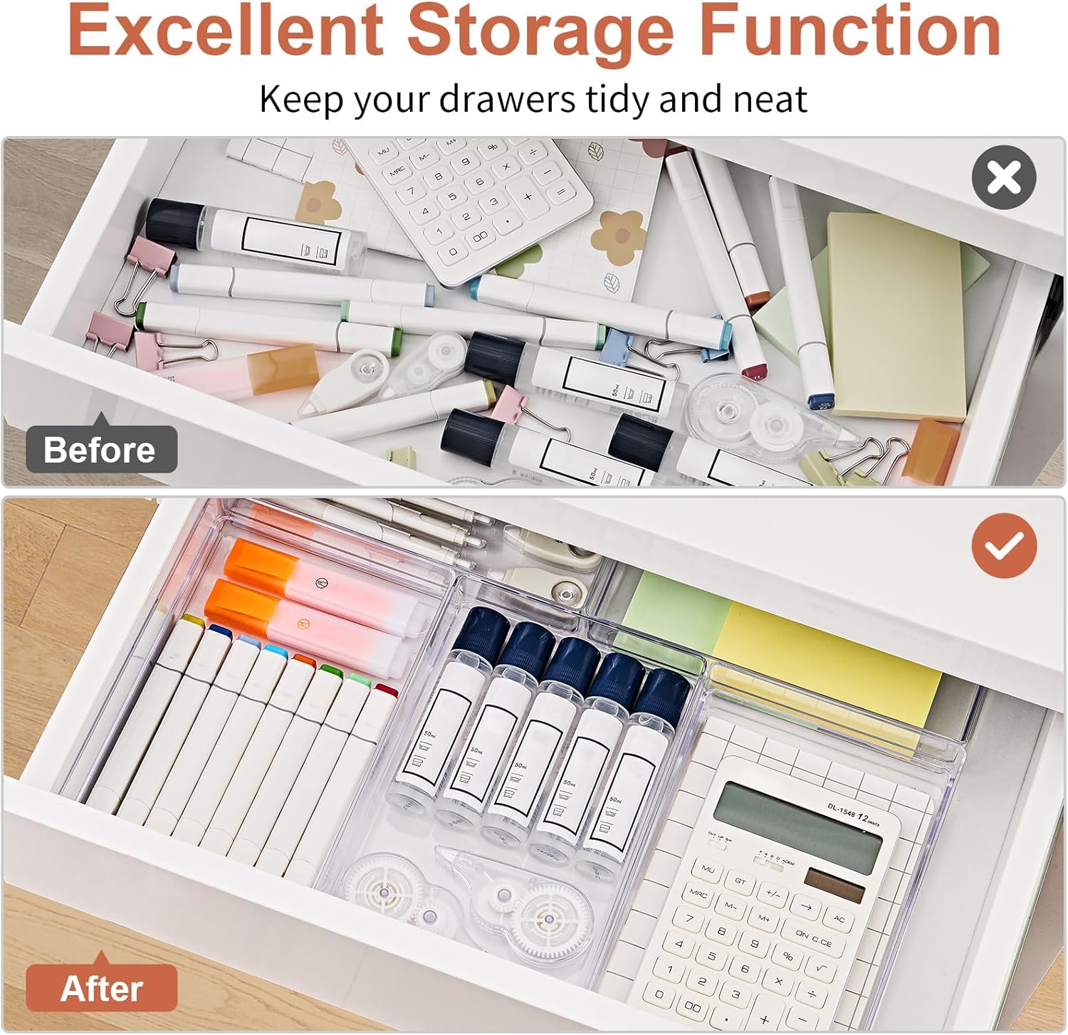 - Space Saving and Stackable Trays: Stackable drawer organizers can be stacked and sorted out in your space easily. Clear drawer organizers can save you time to organize and find your stuff, itβs easy to find and use your items in the drawer, keep your space neat, and help you get a neat lifestyle and enjoy more.