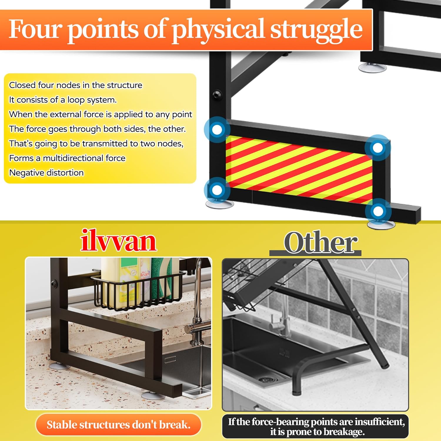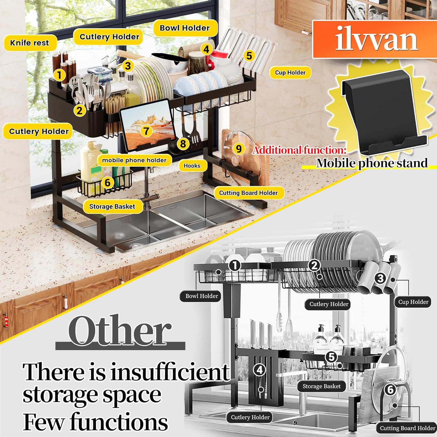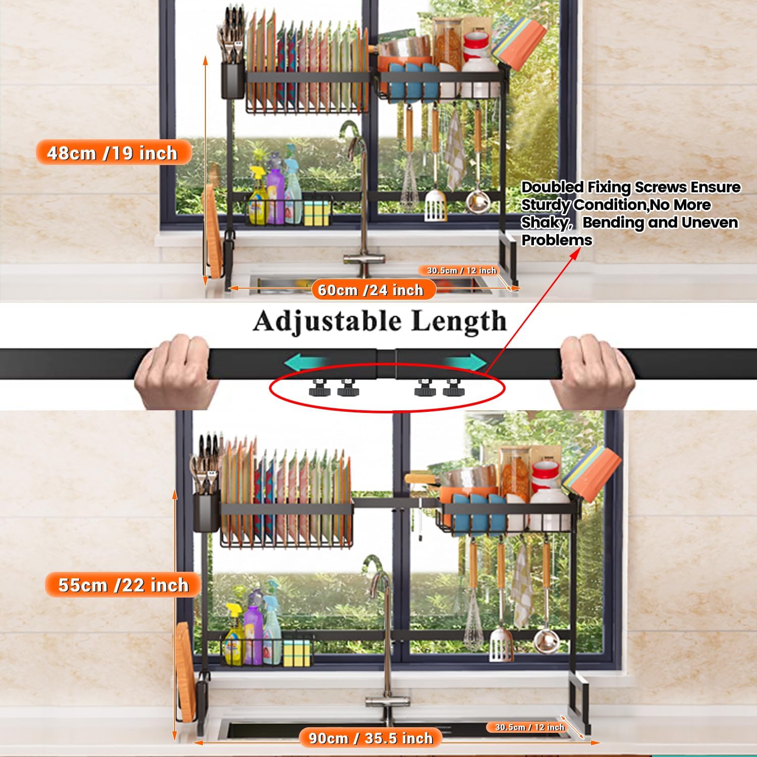 - ăTips Before PurchaseăPlease carefully measure the length of your sink at first. Your Sink Length should be â€35" and if it beyond 35", please choose our another larger over sink dish rack. Also mind the faucet (Heightâ€17") and the cabinet (another 15 or 20 inches away from the upper cabinet to place the plates), the height of this rack can be adjusted from 19" to 22", so please make sure you measure your faucet and cabinet so that the dish rack doesnât touch them or get in the way.