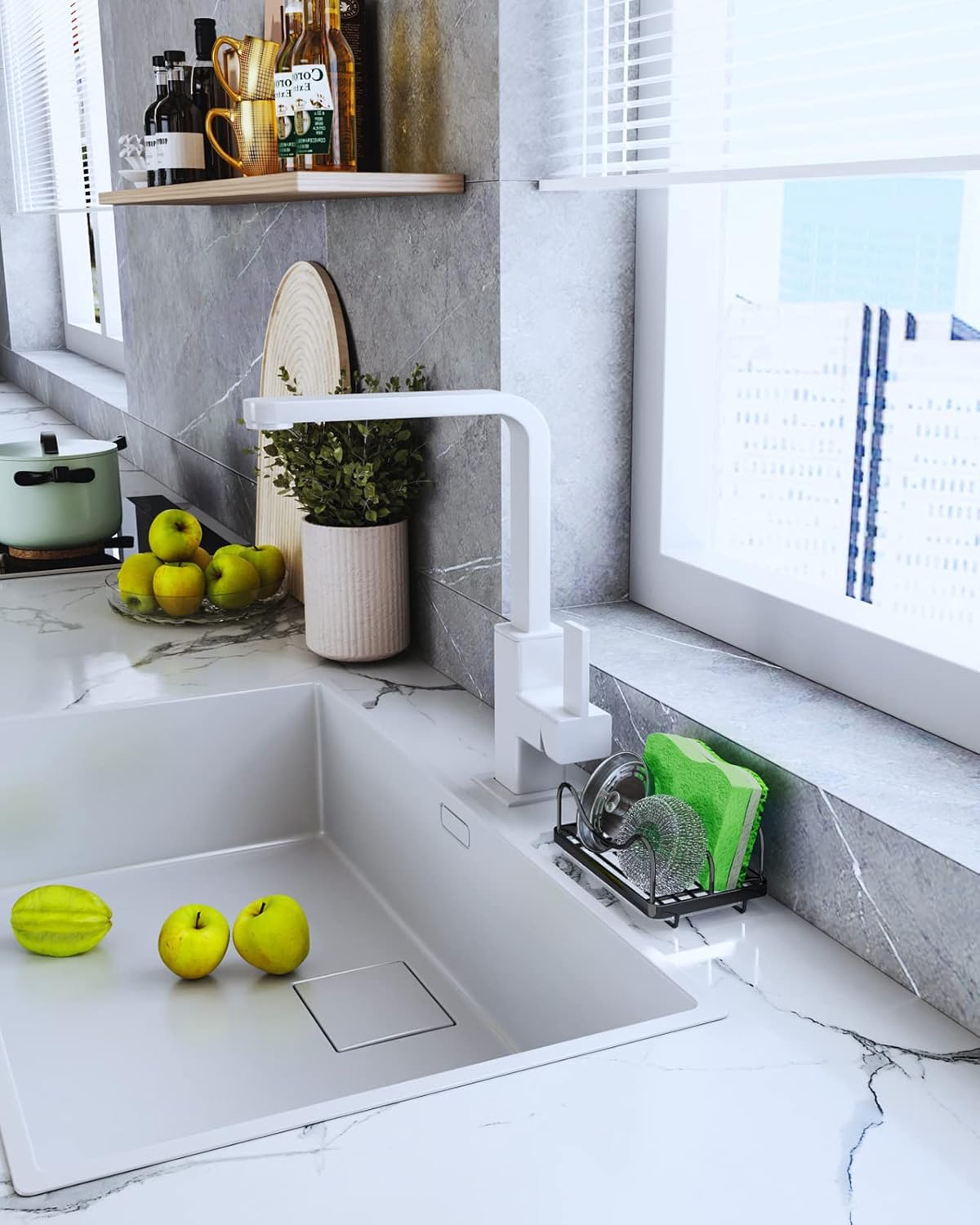 - [Removable Drip Tray & Spill-Proof Design]: The sponge caddy comes with a plastic drip tray that collects drips from the sponge. The tray is easy to pull out, drain and rinse. Kitchen sponge holder for sink tray is designed to be deepened to hold more drips and the water does not spill easily, effectively preventing water stains from contaminating the kitchen countertop and keeping your kitchen counter dry