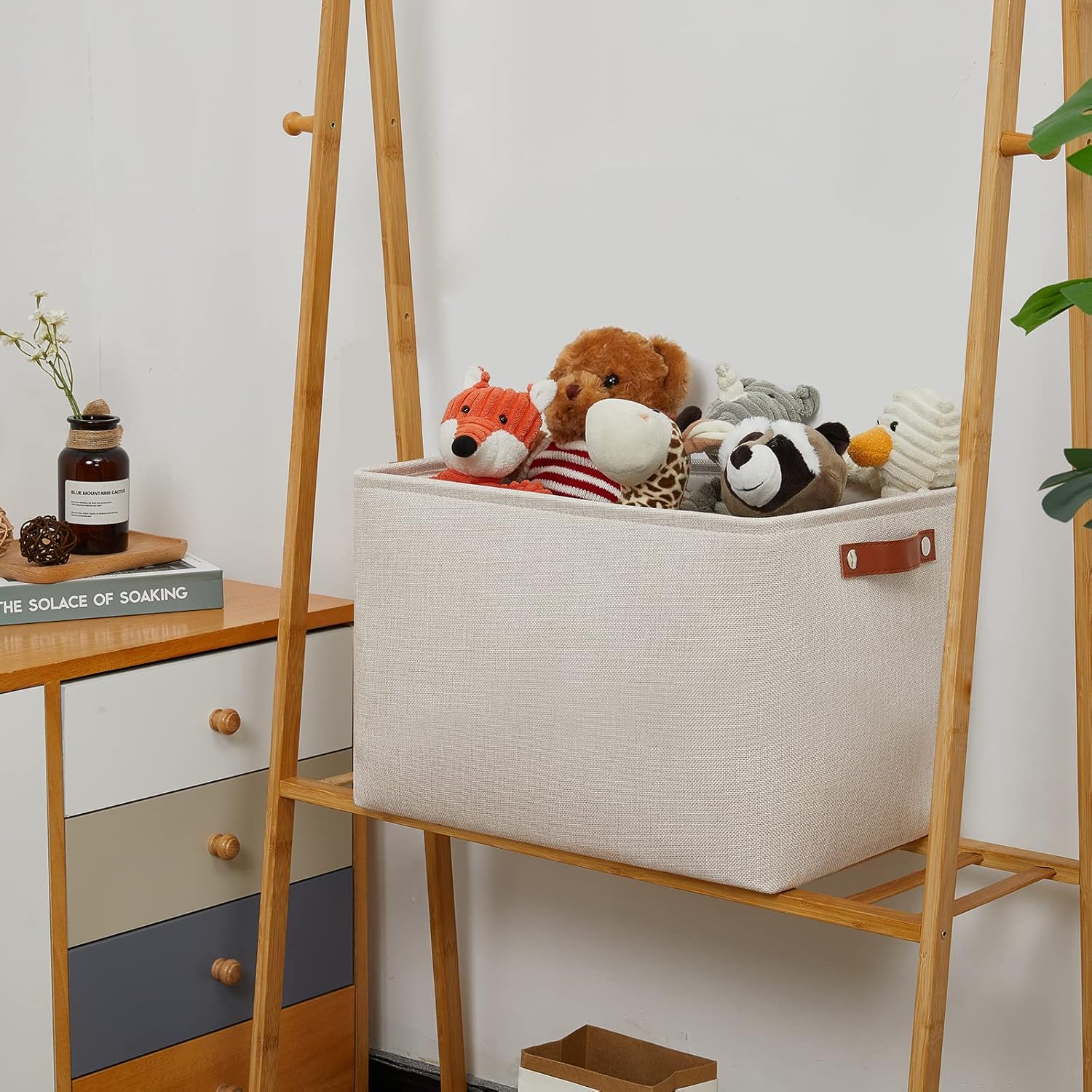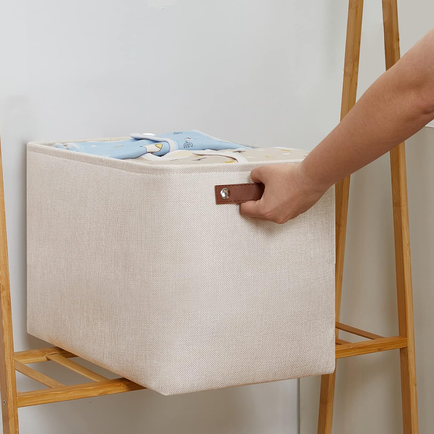 - 【EASY TO CARE】The fabric decorative storage box is sturdy and has no odor. Built to last these bins are reinforced with an O-ring on the top to give shape and structure so they are NOT machine washable. Lined with a thin linen fabric, the large storage bins are easy to clean, just wipe them with a damp sponge or cloth.