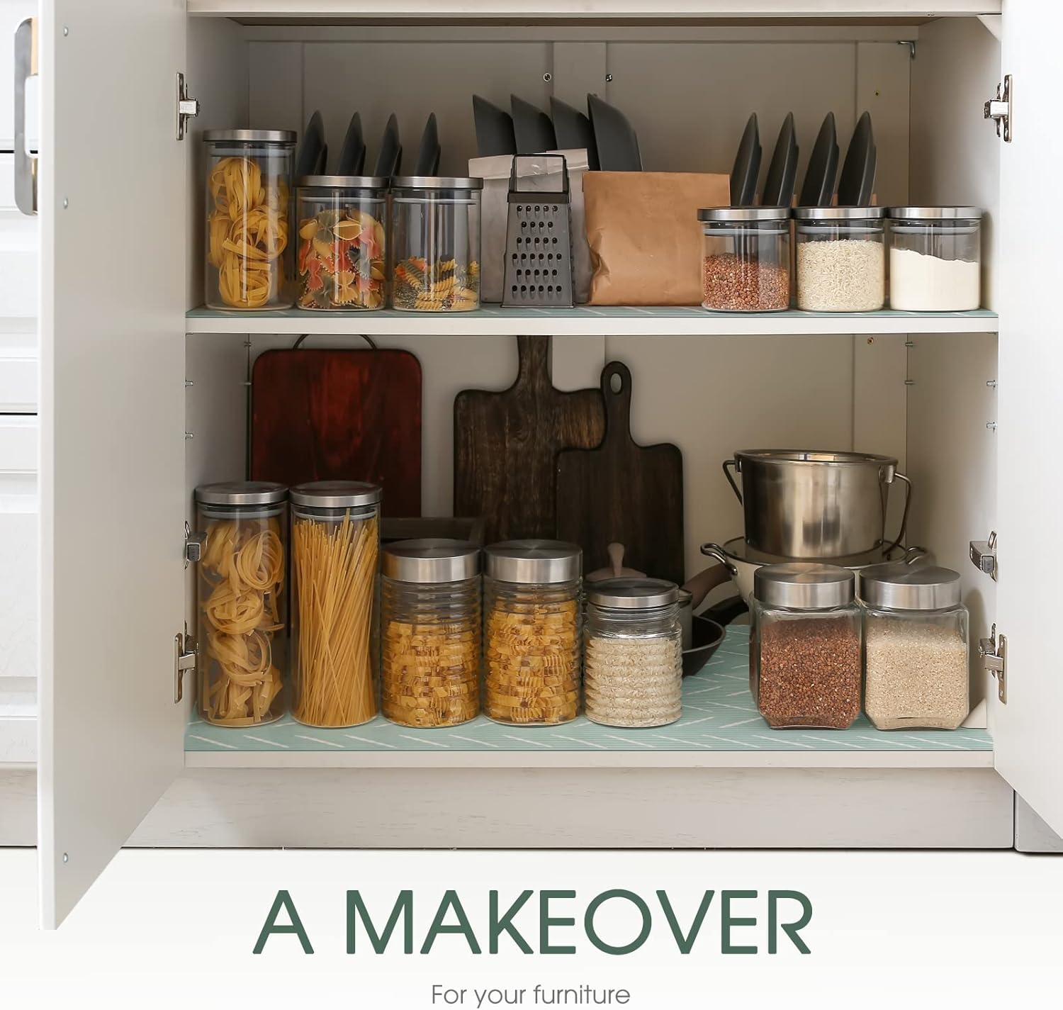 - Premium Cabinet Liner Made of Food-Grade EVA Material: This kitchen, drawer, cabinet, shelf, fridge and general storage shelf liner is made of BPA-free, odor-free, EVA material for your safety. The non-slip design sticker on the bottom of this drawer liners for kitchen allows your kitchen supplies to stay organized, in place and on the shelves, wire rack and pantry