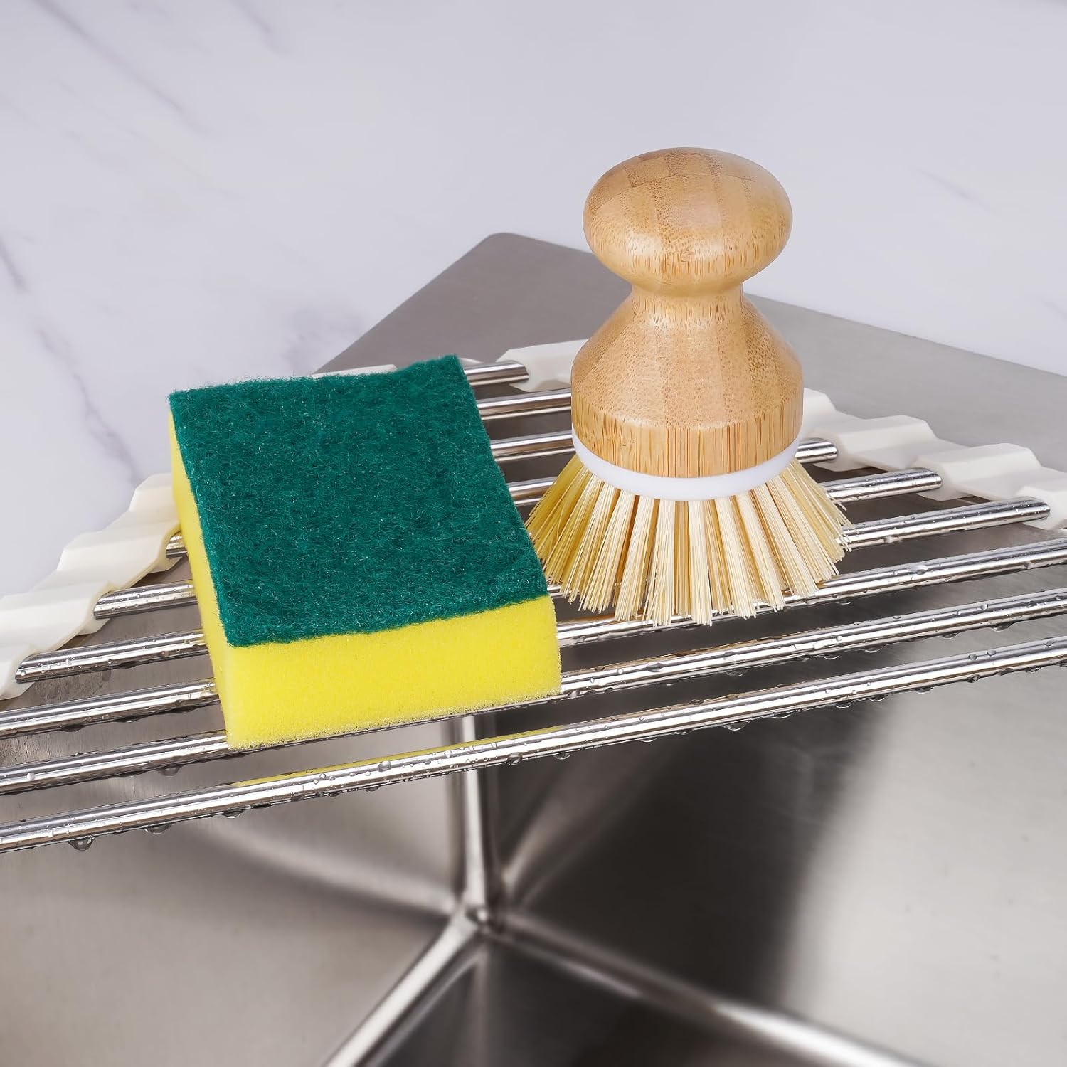 - âď¸ăMultiple UseăThis sink rack can safely carry heavy loads and can be used as a small cutting board for fruits and vegetables, to dry your dishes or for any cooking prep work you need. It is grease resistant and easy to clean with a towel or sponge under the faucet. This rack prevents water on the counter and will give you a nice, clean and tidy space. A must-have accessory for limited counter space and easy to store in the drawer or hang on the wall.