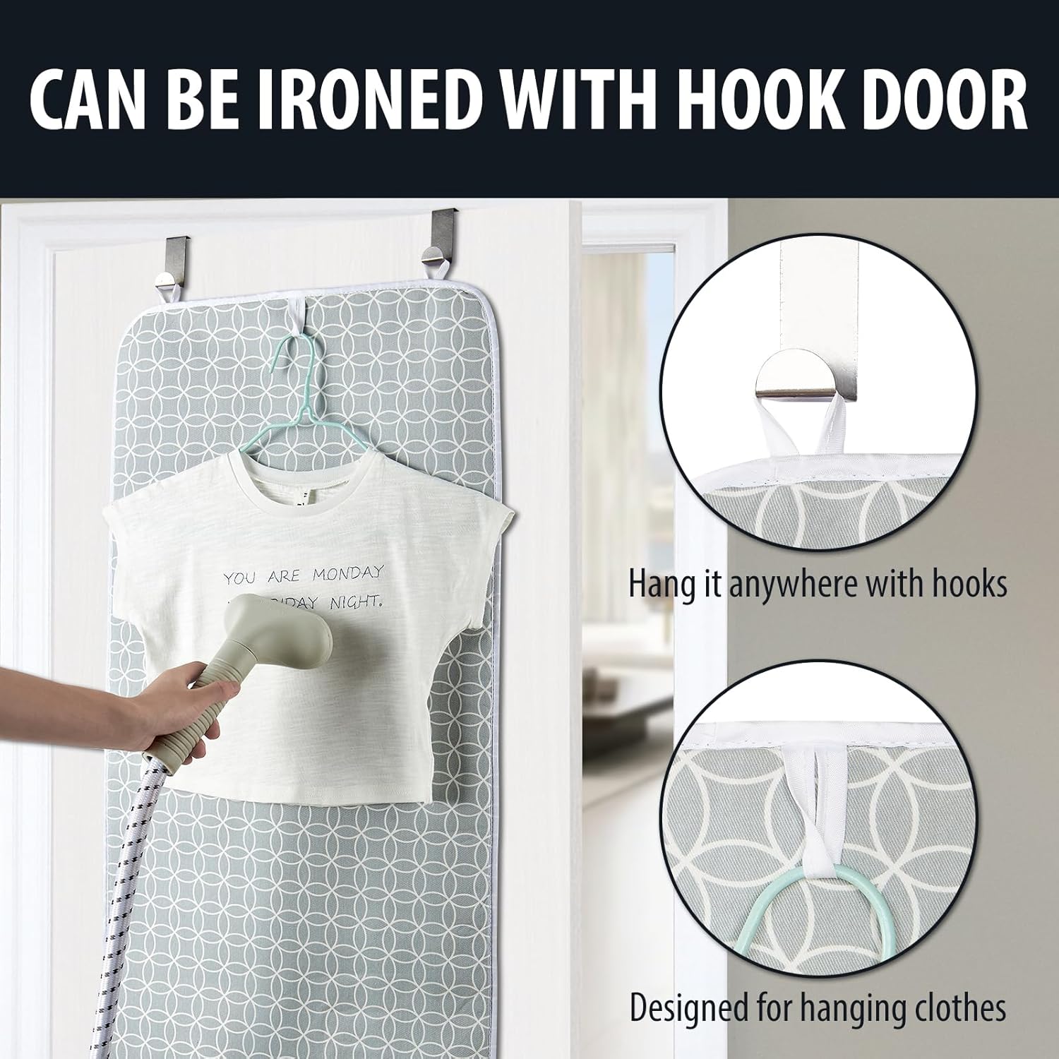 - HANGING IRONING DESIGN: There has three hanging holes on this mat, two for hanging on the door or other places. The middle one is for hanging clothes. Can be used as a over the door ironing board. You are not limited on the table top for ironing. This item is good partner for steam iron. Two hooks are included