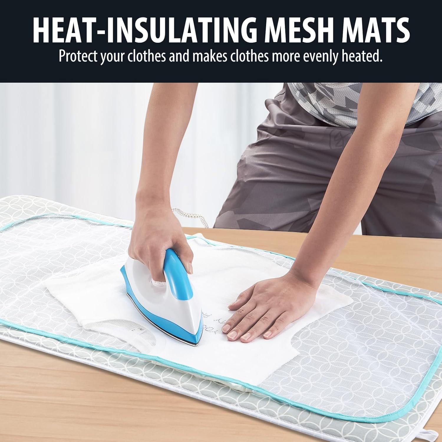 - INSULATION PROTECTIVE MESH: This table top ironing mat comes with a heat insulating and breathable net, meticulous and uniform mesh density makes clothes more evenly heated during ironing, effectively protects your clothes, especially dark clothes and expensive clothes
