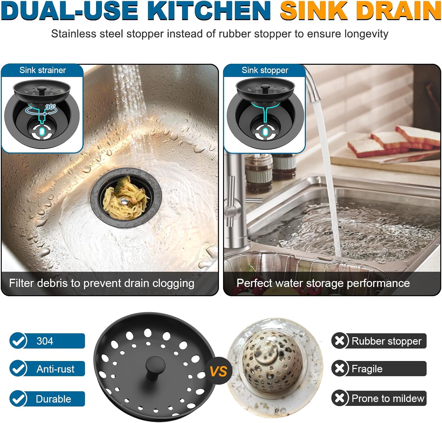 • BUILT TO LAST -- Black kitchen drain assembly is made of 304 stainless steel, which is durable, rust and corrosion resistant. Perfectly fits most US home and commercial kitchen sinks with a 3.5" drain hole and supports up to 0.43" sink thickness