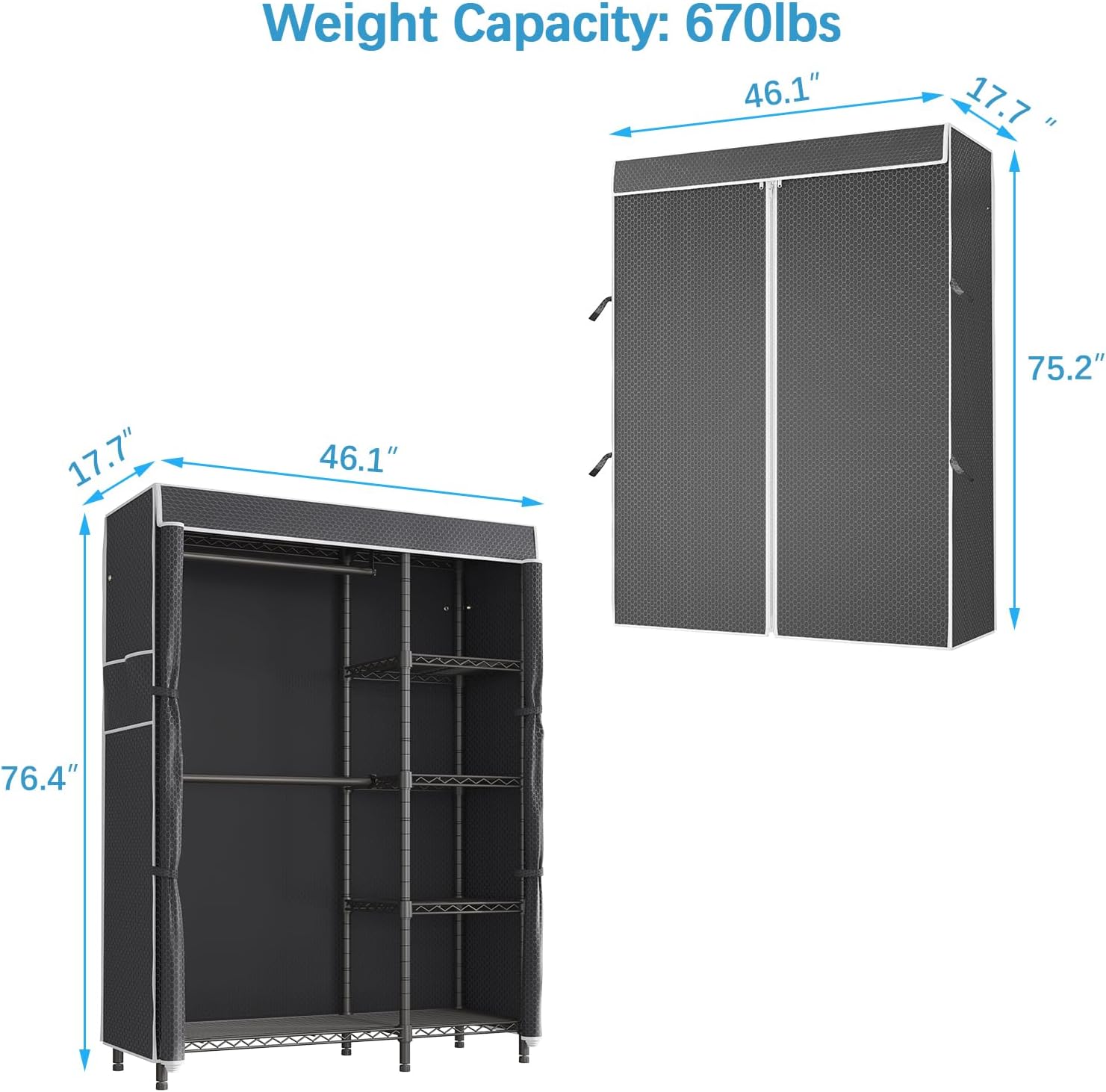 - 【Dimension & Load Capacity】VIPEK V7C closet system is with dimension 46.1"Lx17.7"Wx76.4"H,max load 670 lbs. Besides, single hanging rod hold up to 90lbs and single wire shelf 88lbs. Maximize your storage space