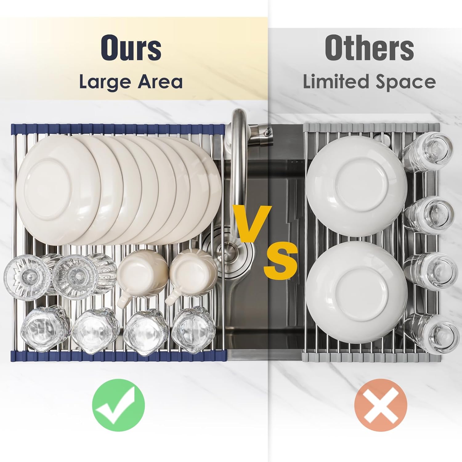 Tomorotec 17.7" x 15.5" Roll Up Dish Drying Rack Over Sink Drying Rack Sink Cover Kitchen Sink Accessories Gadget Multipurpose Organizer Foldable Stainless Steel Drainer