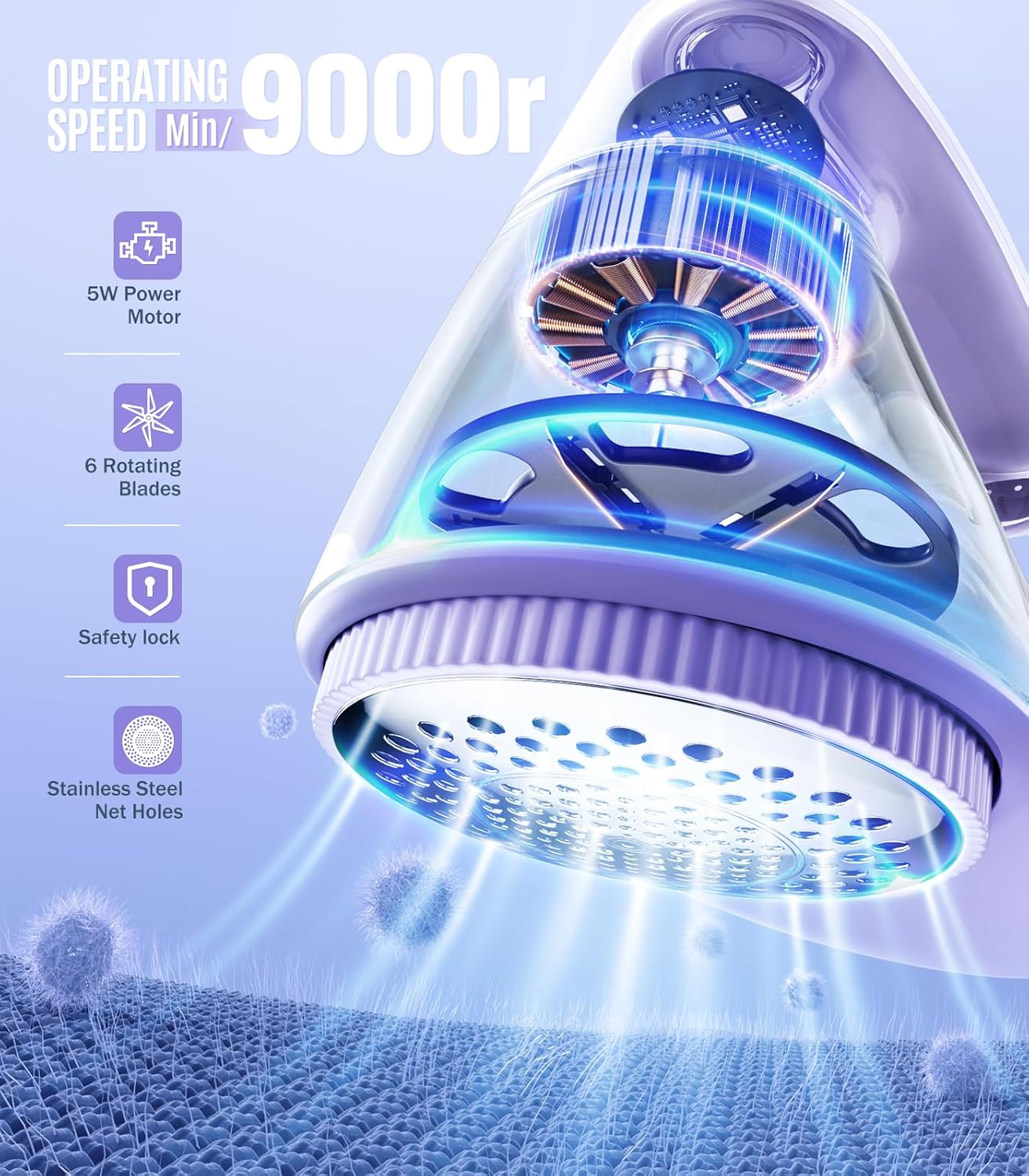 - Quick Results in Seconds: POPCHOSE electric fabric shaver feature 6-leaf blades and larger shaving head that instantly removes lint ball, pilling, fuzz from most fabrics. It is 60% more efficient than others with its 9,000 spin per minute