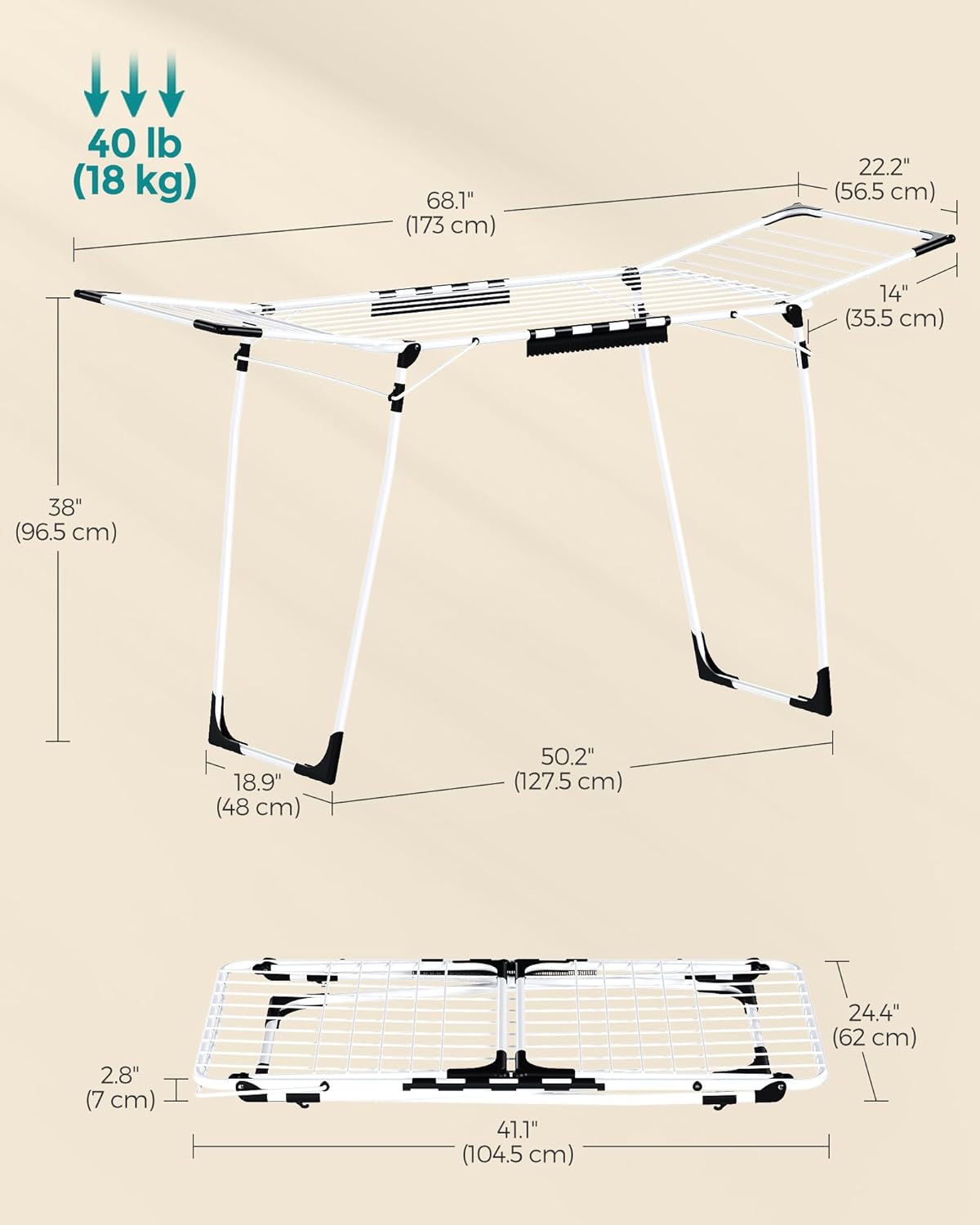 SONGMICS Clothes Drying Rack Foldable, Gullwing Laundry Drying Rack, Space-Saving, 22.2 x 68.1 x 38 Inches, Sock Clips, Metal Structure, for Clothes, Towels, Linens, Indoor, Outdoor White ULLR518W01