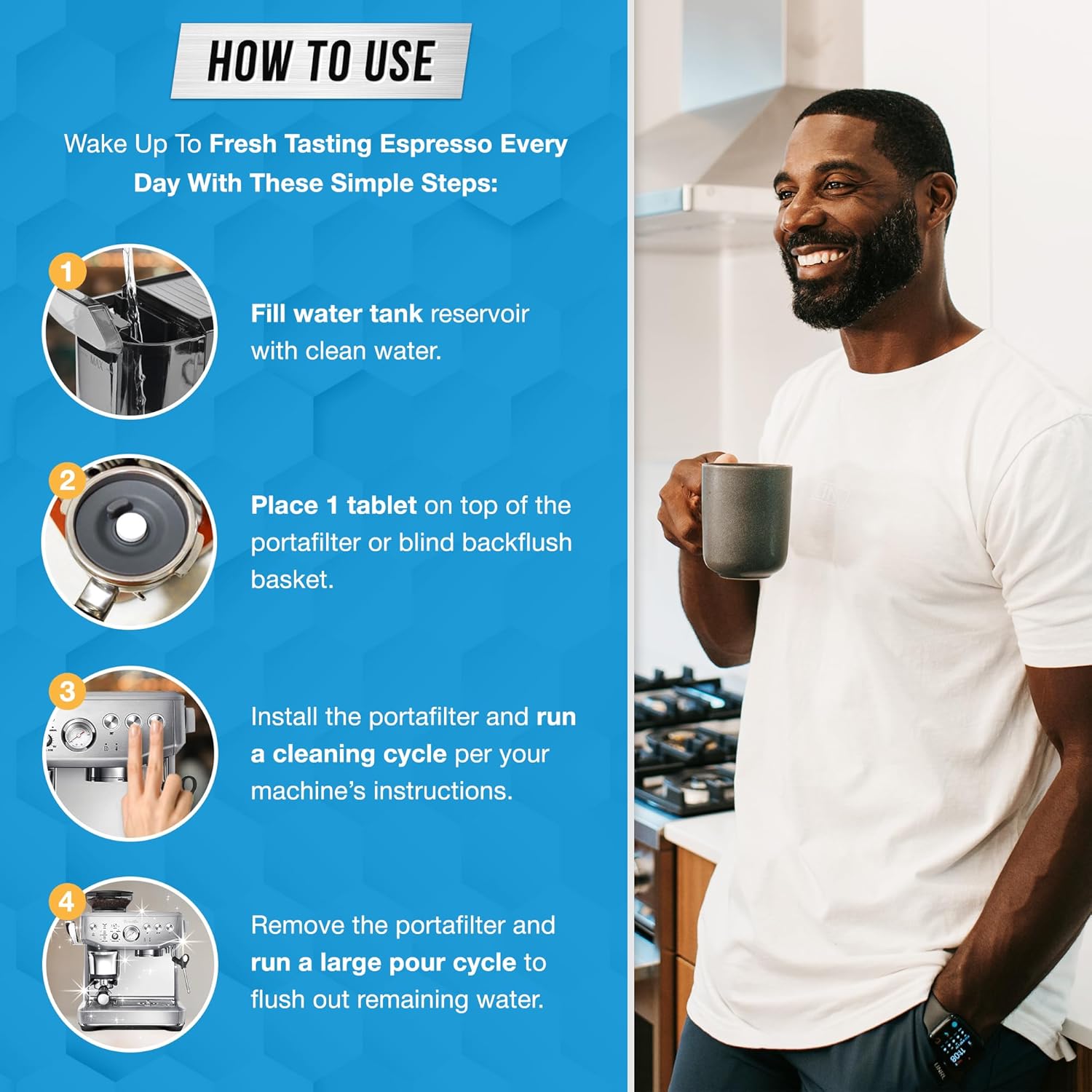 - Easy Daily Backflush Tablet: Clean Daily with one ACTIVE Decalcifying Tablet, follow your typical backflush regimen or machine manufacturer instructions