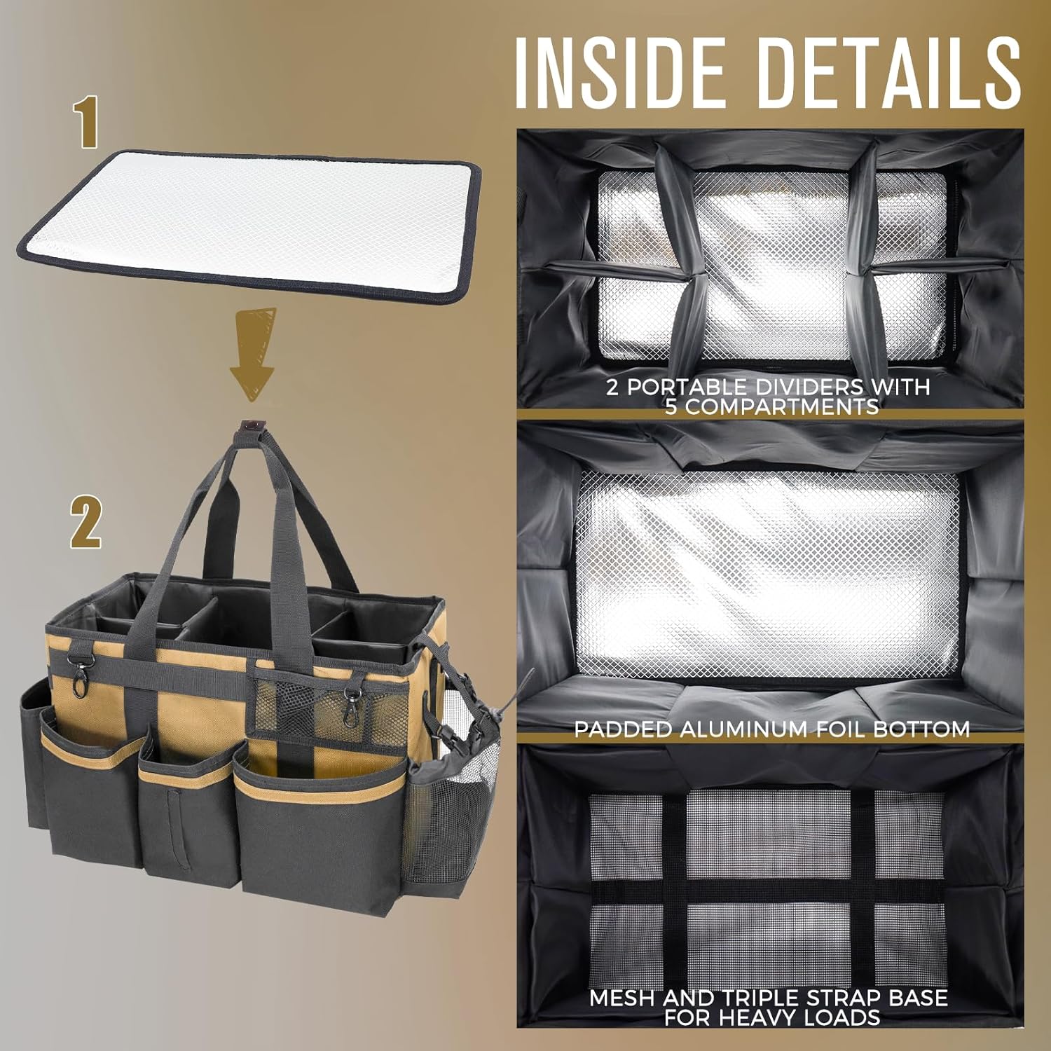 Wearable Cleaning Caddy Organizer with Handle & Shoulder Straps for Housekeepers, Under Sink & Car Cleaning Tool Organizer Bag with 4 Foldable Dividers (Tan)