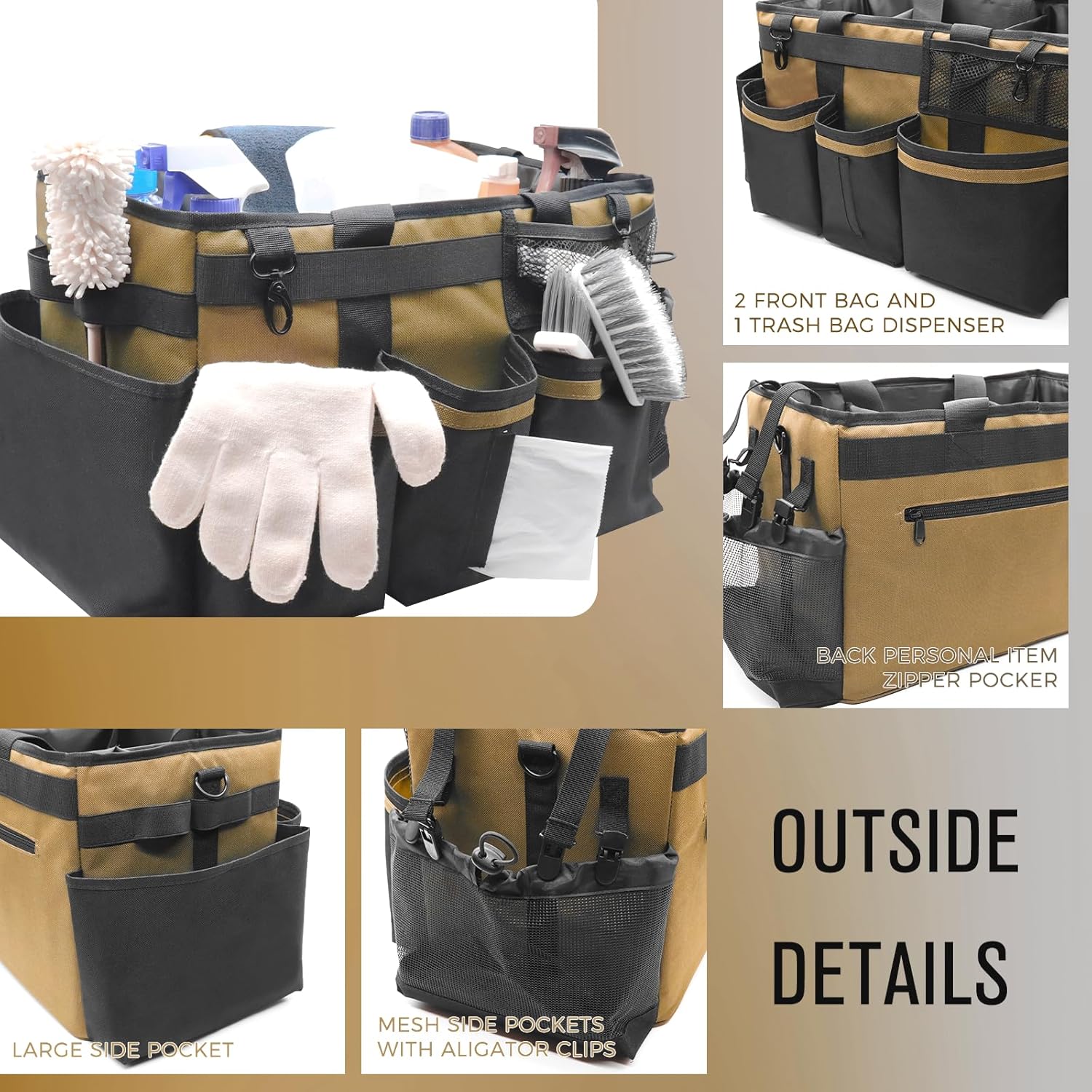 - Exquisite Details: The 5 inner compartments are large enough for organizing cleaning tools. 3 individual deep outer pockets, 1 mesh side pocket and 1 trash bag dispenser allow you storage and access of other cleaning tools. Also, securely zipped pocket is design for safely storing your important items