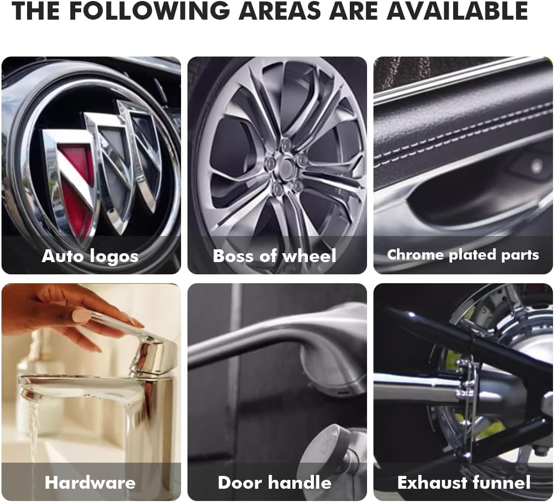 - ADVANCED CLEANING - The Chrome cleaner cuts through grime without precleaning, quick way to clean any hard or decorative chrome finish, including chrome plating, PVD chrome, and even today's chromed plastics, easy to removes fingerprints, smudges, dust and even light water spots, Effectively eliminates stains, oxidation, and grime, and add a long-lasting shine. keep your wheels, trim and accessories sparkling, anytime, anywhere.