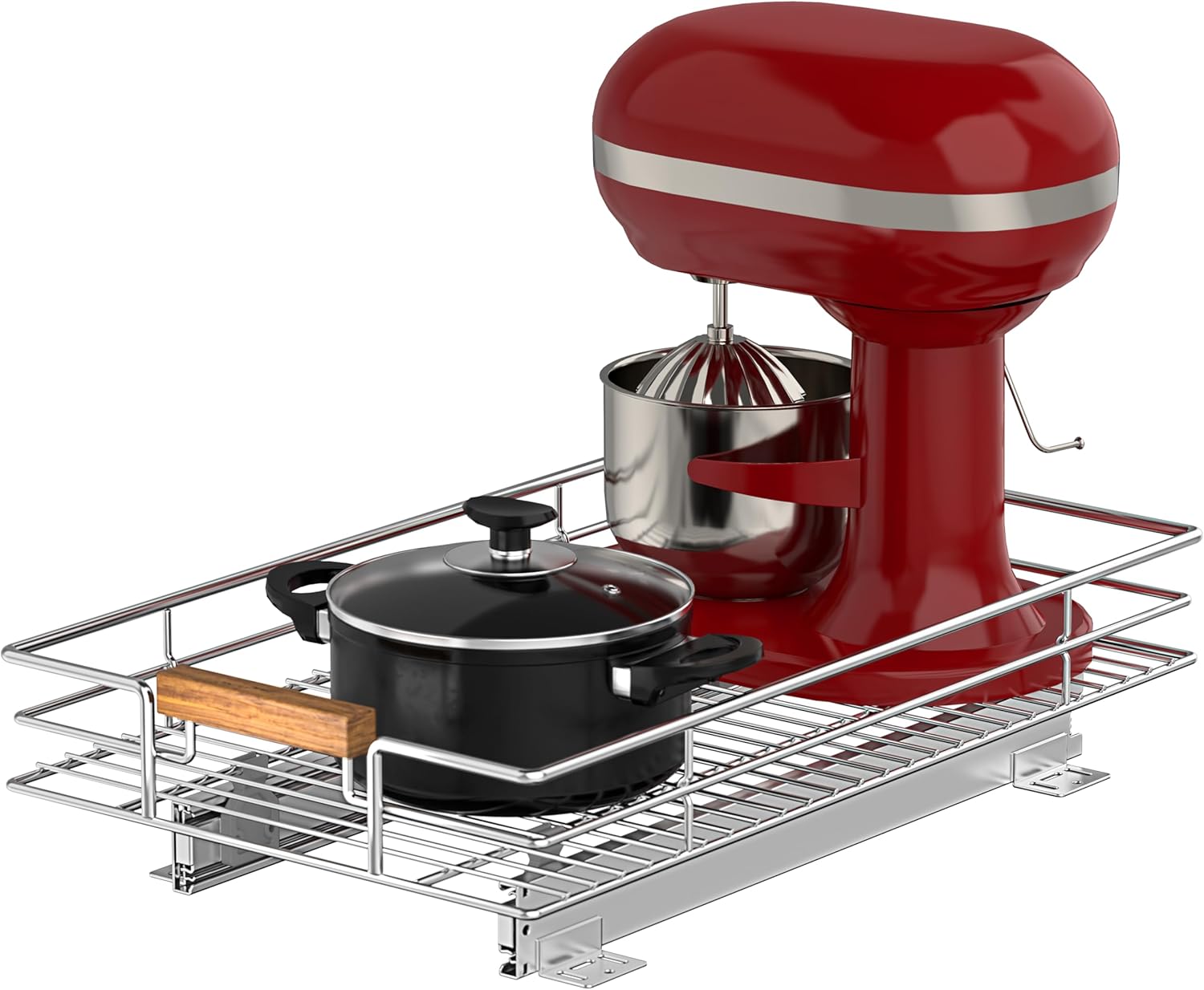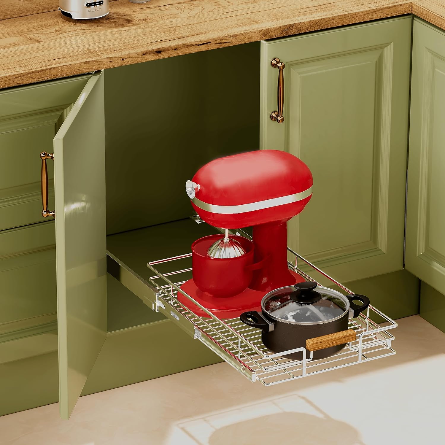 Pull Out Cabinet Organizer(14" W x 21" D), Heavy Duty Slide Out Pantry Shelves, Storage Shelf Drawer Basket for 15-1/4” Cabinet Opening, Pull Shelf Storage for Pots, Chrome