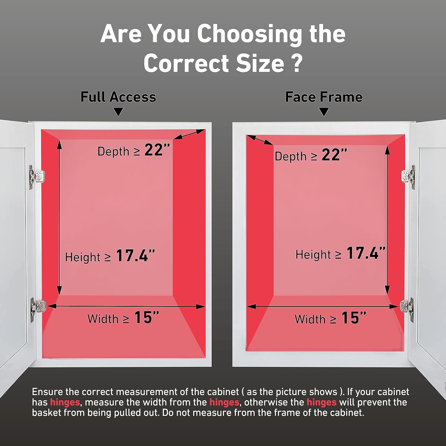 - 【Choose Suitable Size】 Our cabinet pull out shelf dimensions measure 14" Wide x 21" Depth x 16.4" Height. Requires at least 15 inch inner wide openings(inner wide must be measure from the hinges), 22 inch inner depth and 17.4 inch inner height.