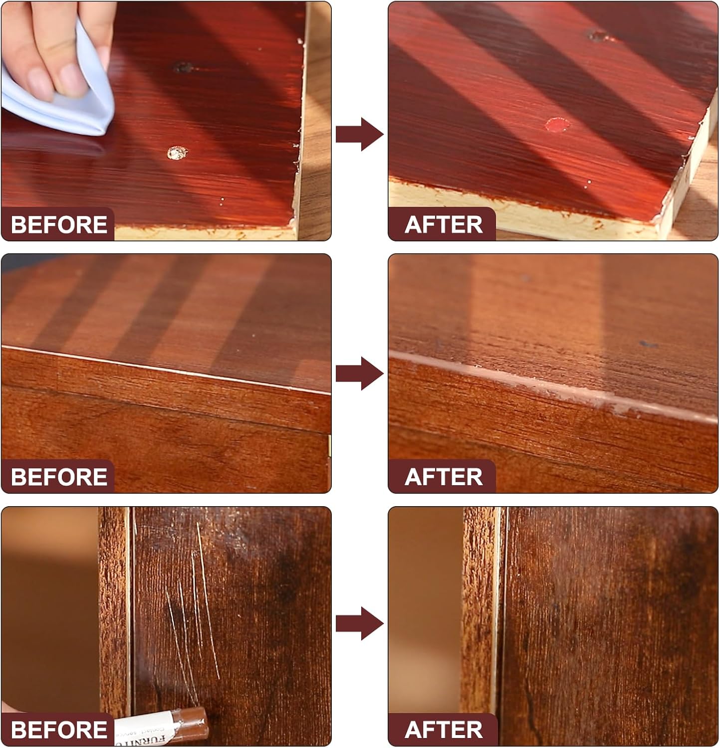 - How to Use: Choose a set of wooden crayons that match the color of your furniture. First, clean the area to be repaired with a dry towel or paper. If it is to repair the furniture whose surface is slightly damaged, you only need to gently wipe the damaged area. If it is a larger area, you can use a high temperature equipment to heat the wax, let the melted crayon drips all over the depression, then smooth it with plastic card and wait the wax dry. (plastic card not included in the package)