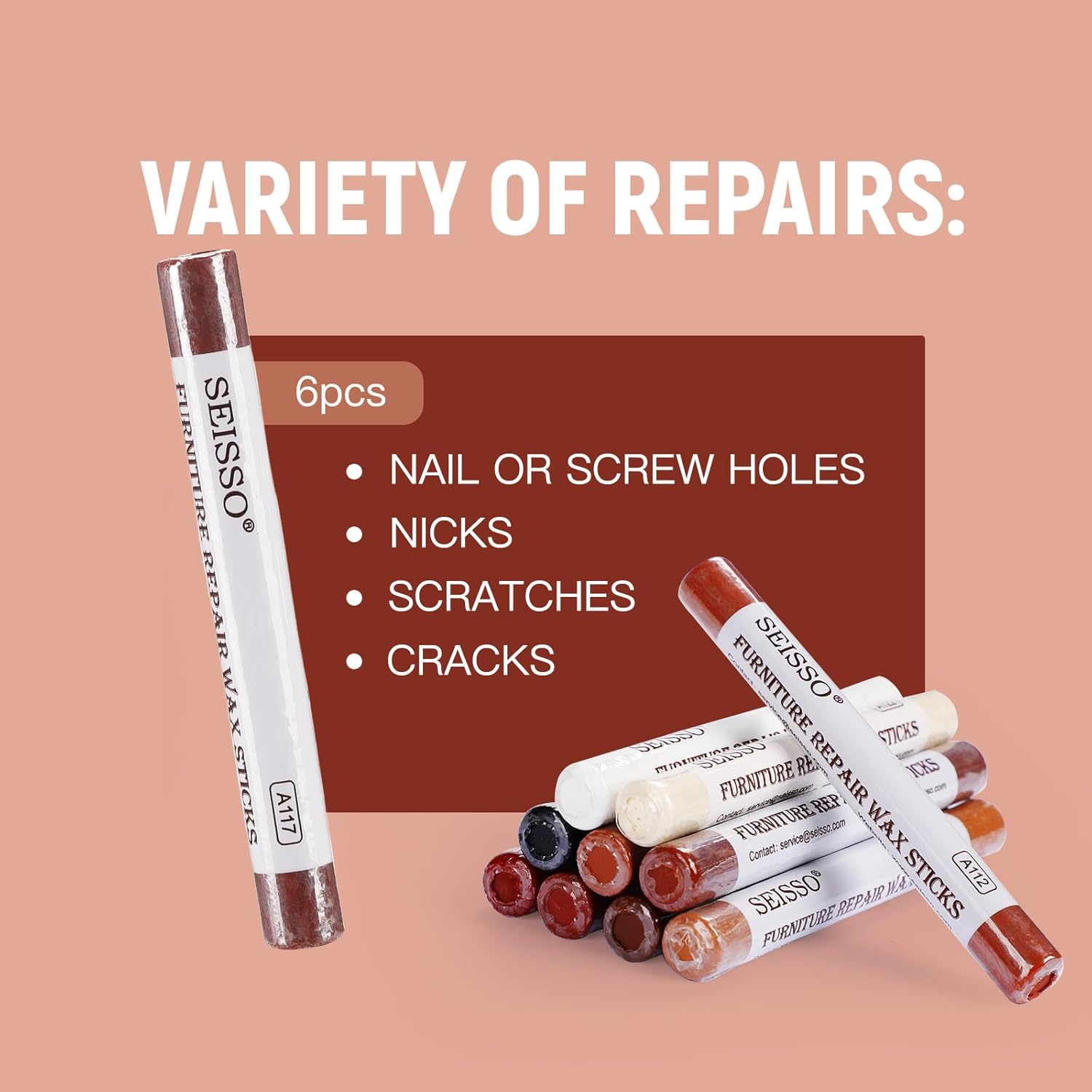 SEISSO Wood Filler Sticks- 6 Pcs, Furniture Repair Wax Crayons, Furniture Marking Repair - Scratch, Cracks, Hole, Table, Wood Floor, Guitar - Heartwood Cherry/Red Brown/Nutmeg