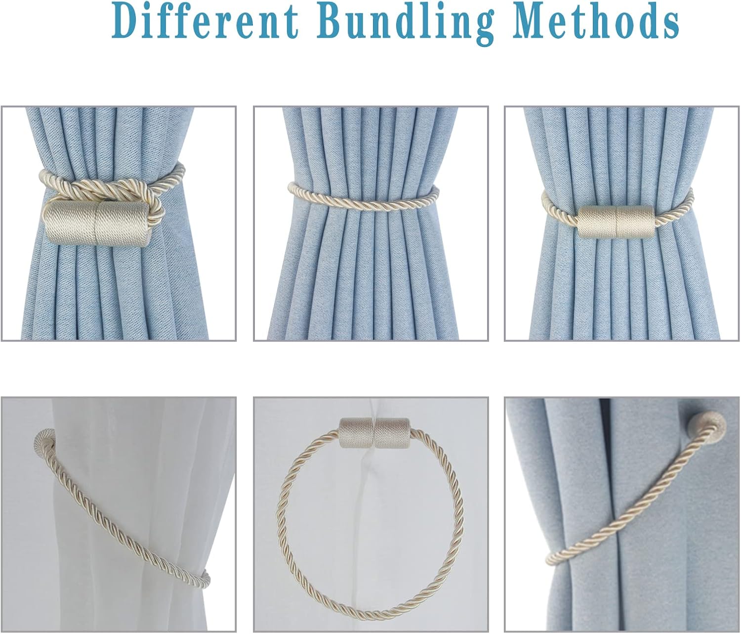 - High-Quality Materials- Magnetic curtain tie backs use an upgraded version of nickel-plated magnets, which are strong and smooth. The brightly colored twisted woven βtexture rope is hand-woven with premium polyester materials. very soft and good feeling. Beige/Gold/Black/White/Grey/Khaki/Coffee/Blue -Eight colors to choose from