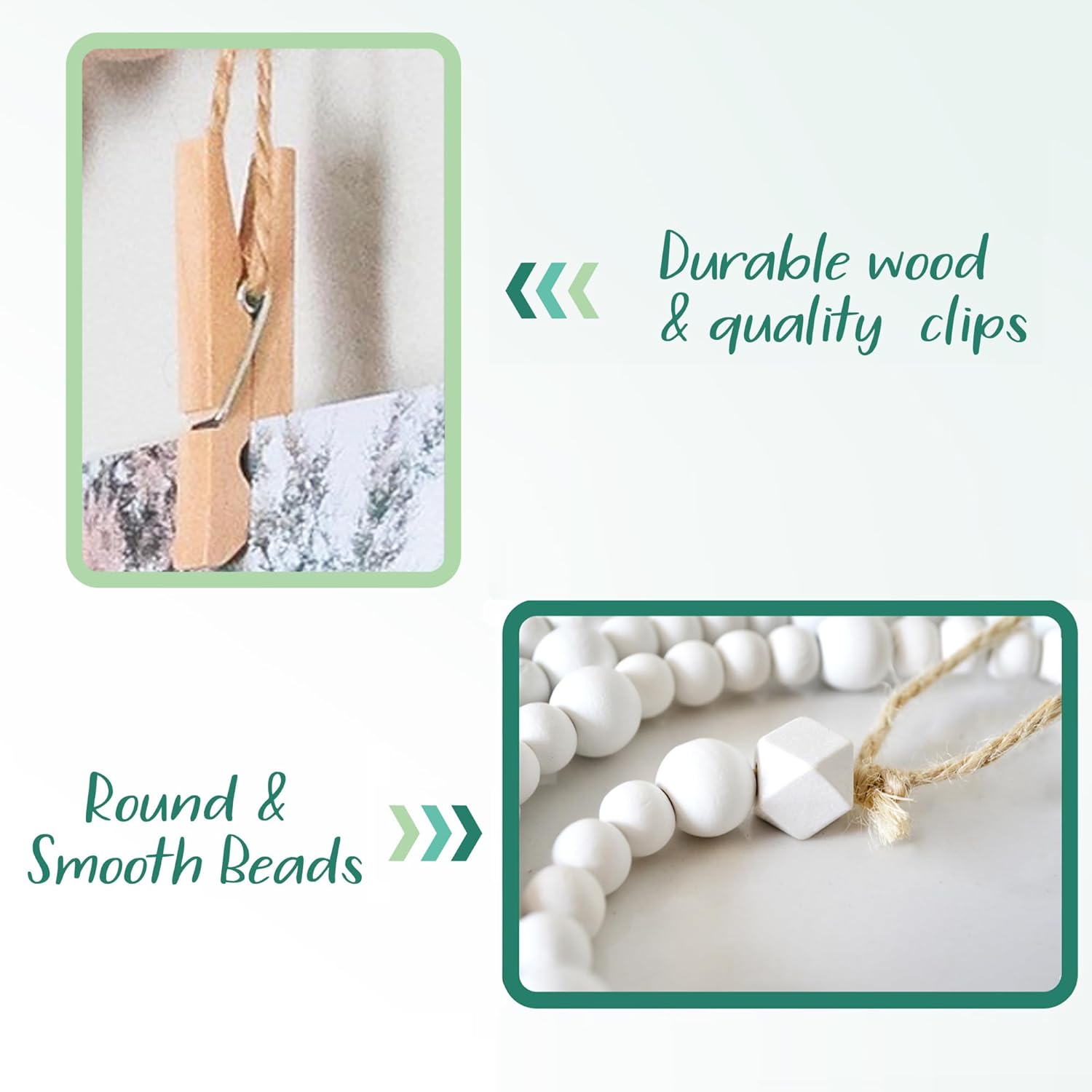 - QUALITY MATERIAL: Made of round wood beads strung together using jute rope with 14 clothespins attached. Approx. 2loops on each end for easy hanging.