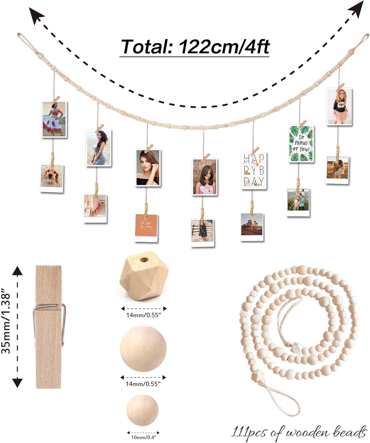 4 Feet Wooden Beads Garland with Clothespins Picture Cards Holder - Country Farmhouse Christmas Nursery Boho Holiday Decorations with Clips