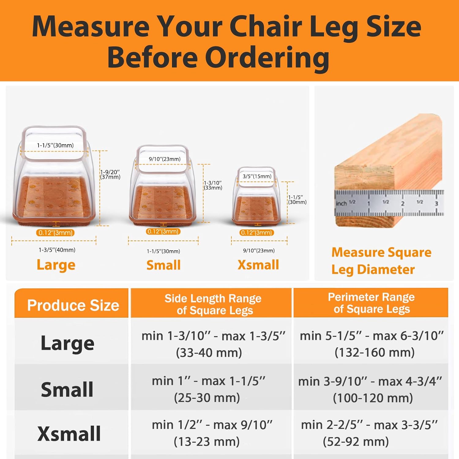 - APPLICABLE SHAPES AND SIZES: Our chair leg floor protectors only fit wooden square chair legs. Compared with the round chair leg caps, square chair leg floor protector fits the square chair leg better. We have tow sizes chair leg protectors for hardwood floors.Please measure the size of your furniture feet before buying.The L size chair leg floor protectors square is suitable for square leg with side length 1-3/10"" to 1-3/5""(33-40mm), irregular leg with perimeter 5-1/5"" to 6-3/10""(132-160mm)