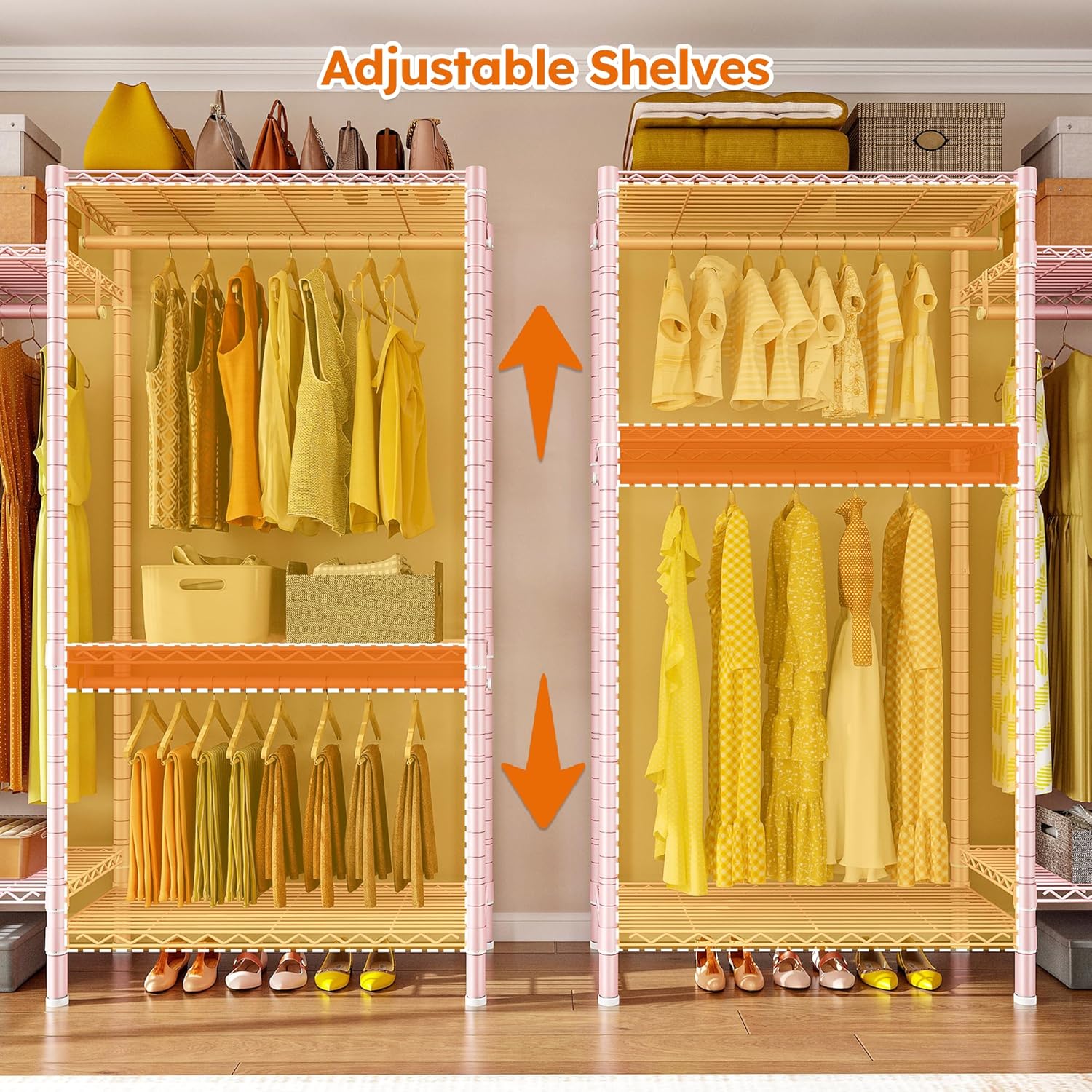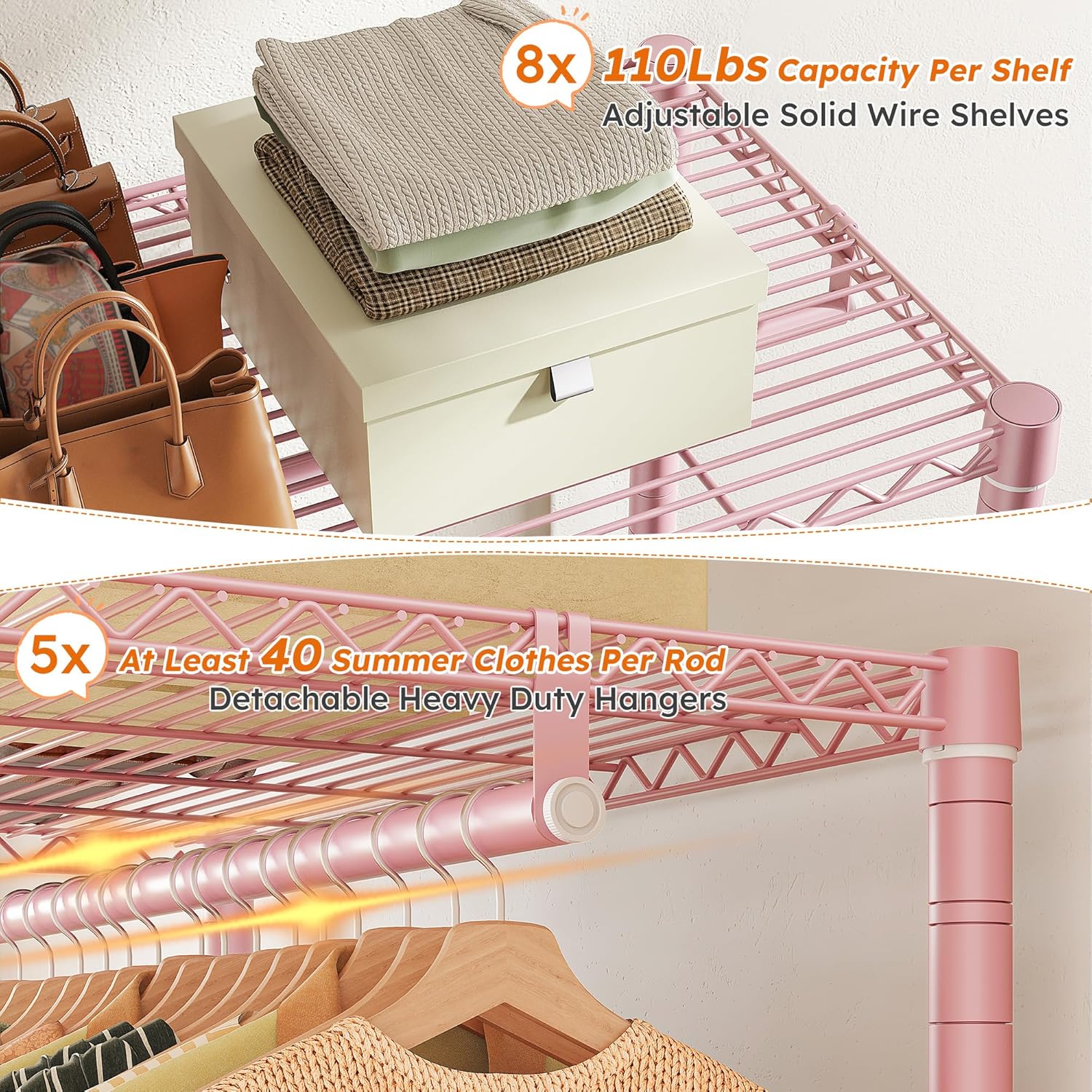 Raybee Clothes Rack,Clothing Racks for Hanging Clothes Heavy Duty,Adjustable Garment Rack with Shelves,Rolling Clothes Rack Max Load 905LBS,75" W x 77" H x 17.8" D Pink