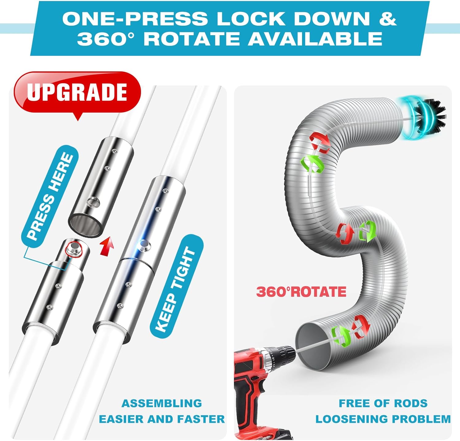 - 【EASY TO INSTALL AND USE】- The quick snap rods are upgraded to assemble faster and NO need to concern rods coming apart whether turning clockwise or counterclockwise. The dryer vent cleaning equipment with auger brush works well with cordless drill, enable to finish dryer cleaning thoroughly and omnidirectional