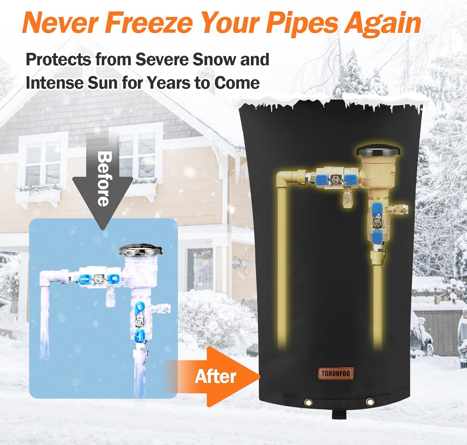 - 【Multipurpose】Our Pipe Insulation Cover works well as a Back Flow Preventer Cover, Sprinkler System Cover, Irrigation System Cover, Well Head Cover Vacuum Breaker Cover, Hose Bib Cover, Well Filter Cover, etc. Protect your device from Severe Snow and Intense Sun.
