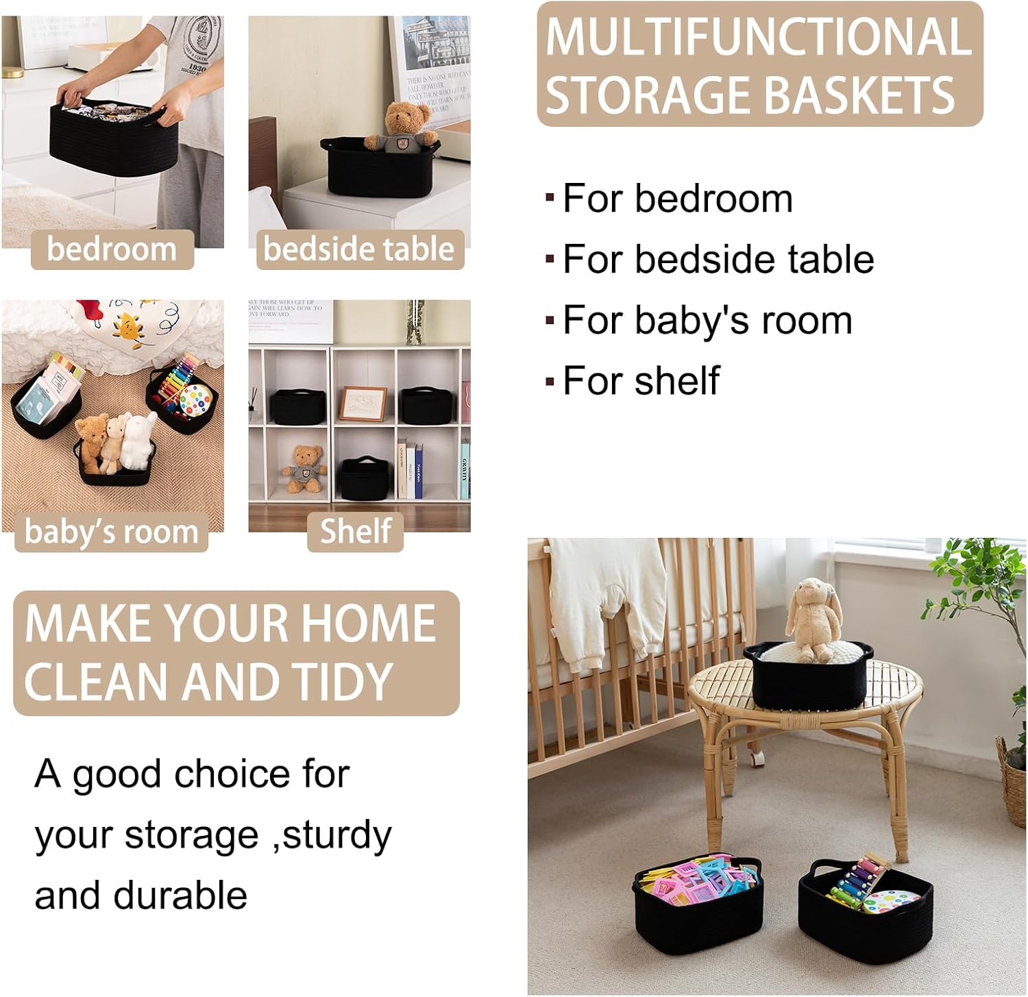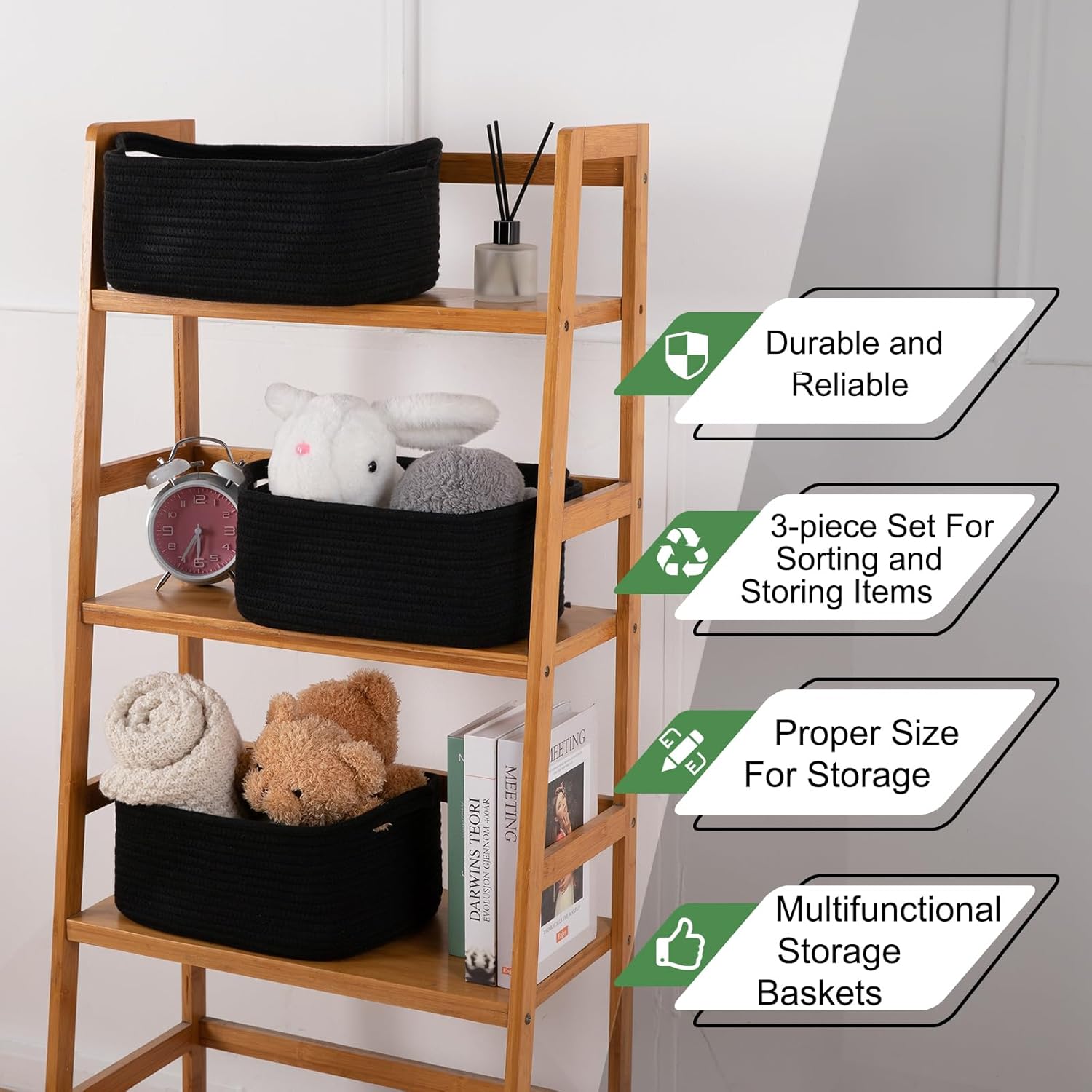 OIAHOMY Cotton Rope Woven Baskets for Storage, Nursery Rectangle Storage Basket with Handles for Shelves, Pack of 3, Black