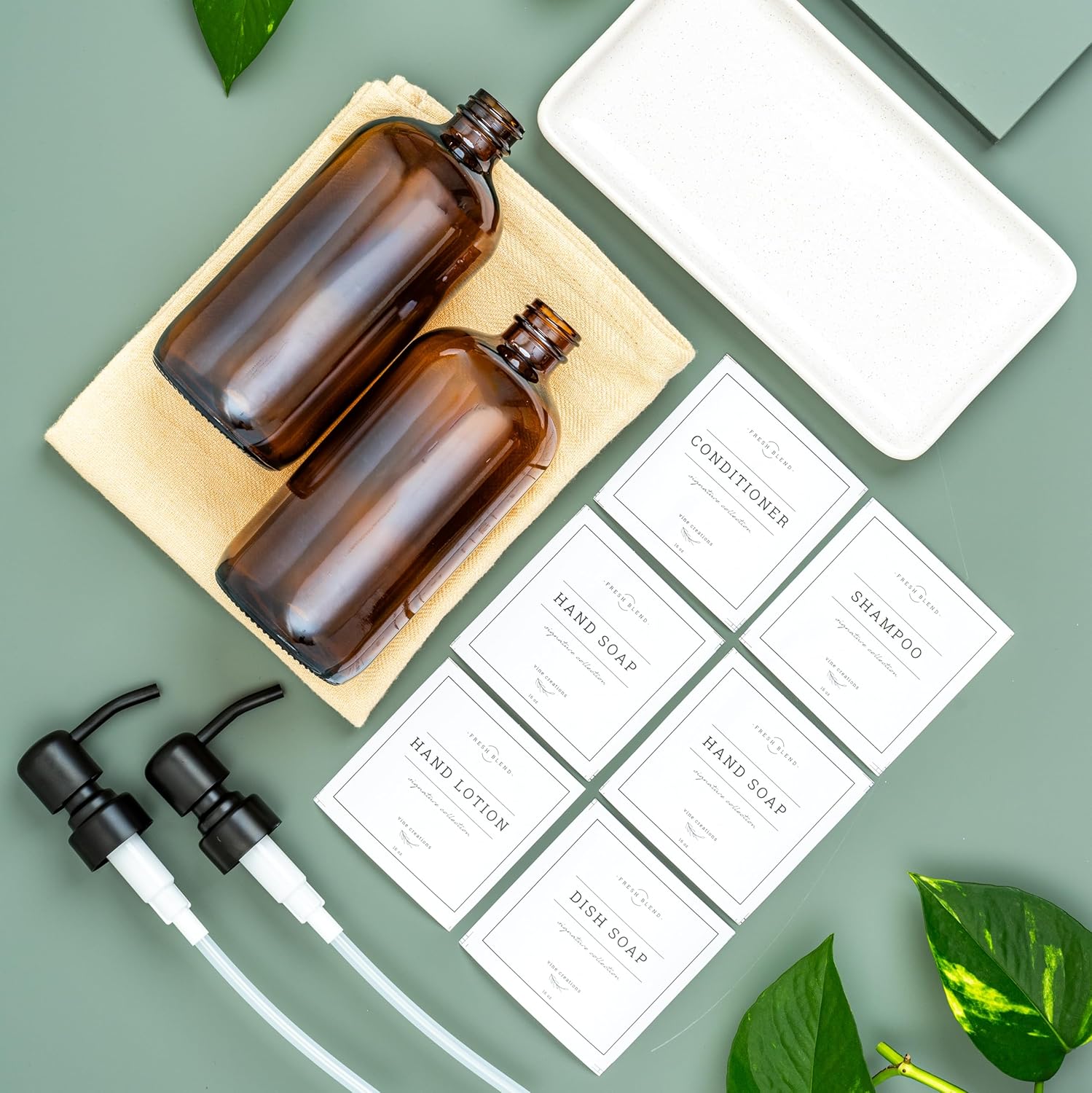 Vine Creations Amber Glass Soap Dispenser, 2 Pack Kitchen Soap Dispenser Set with Ceramic Tray, Stainless Steel Pump, Dish Soap and Hand Soap Dispensers for Bathroom Decor with Waterproof Labels