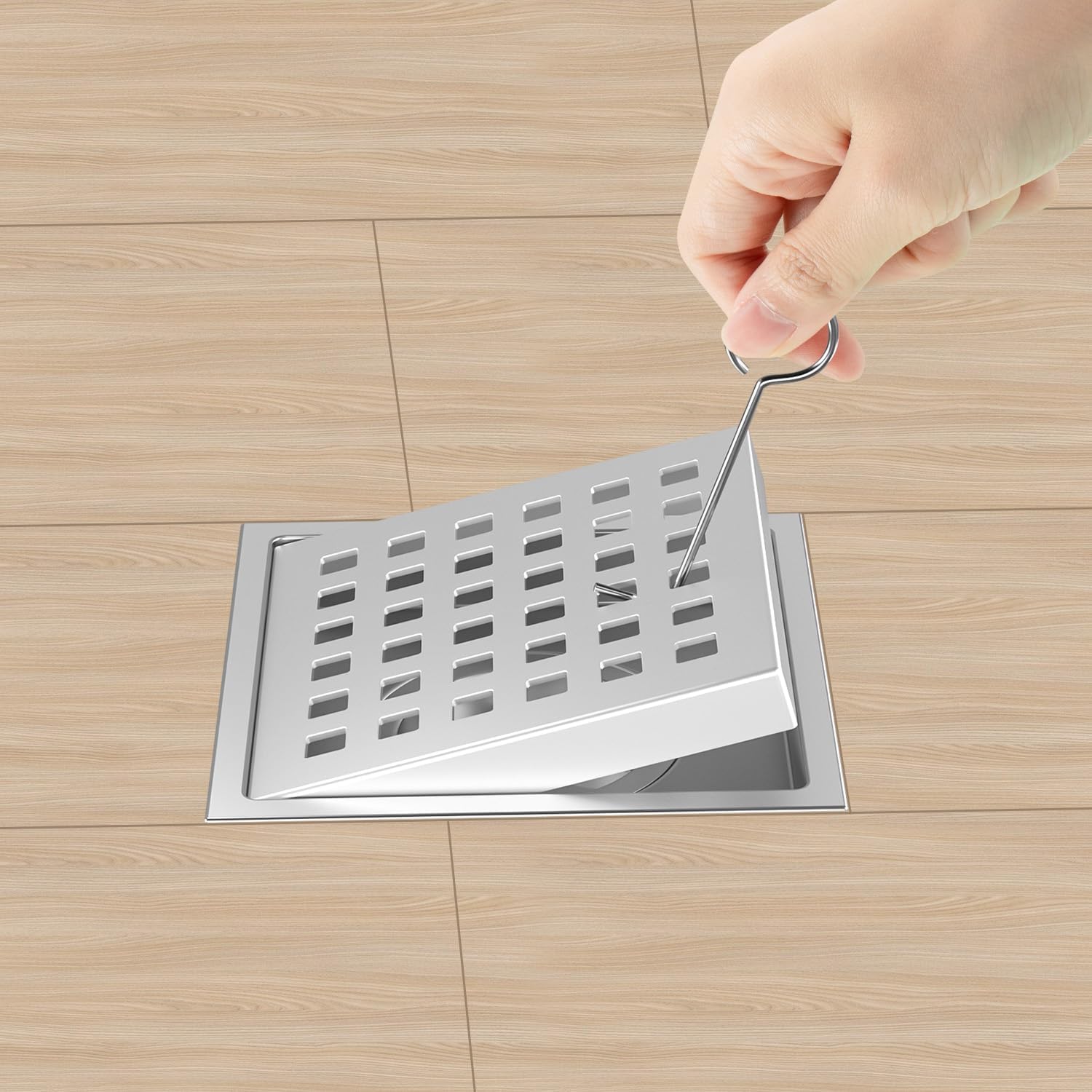 6 Inch Square Shower Drain Chrome, Bathroom Floor Drain, Stainless Steel Drain Kit with Flange, Removable Grid Cover, Hair Strainer
