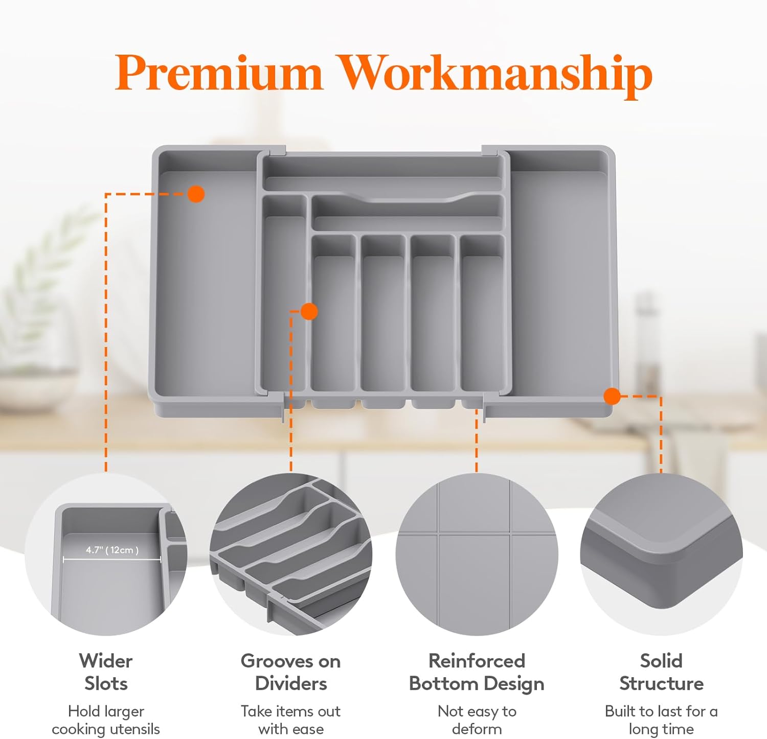 - Sort Your Silverware: The silverware tray comes with 7-9 compartments, creating more space in drawers for spoons, cutlery, and flatware. The expandable sections are ideal for storing larger cooking utensils. Streamline your cooking with a no-install organizer that keeps cutlery at your fingertips