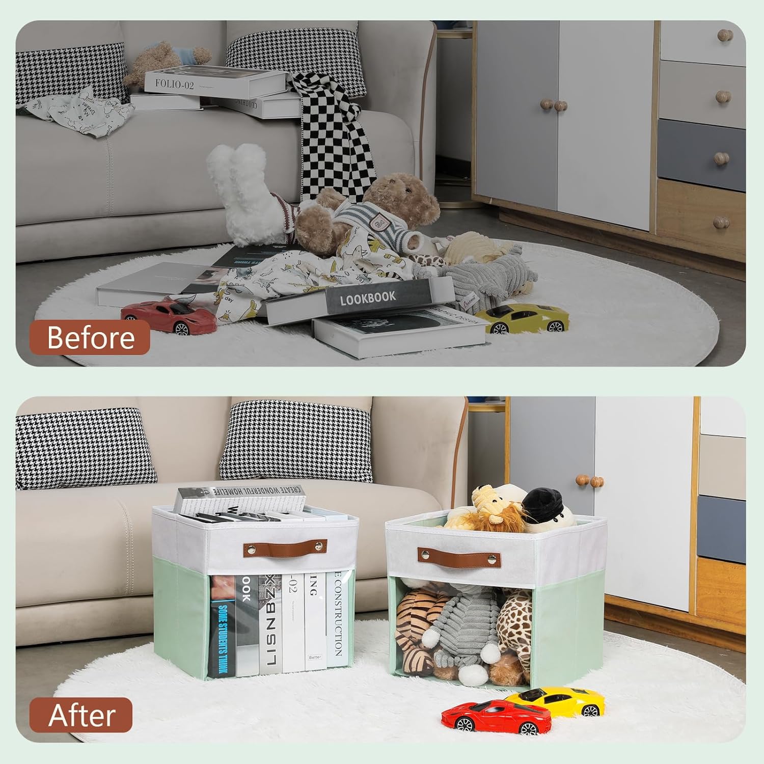 HNZIGE Clear Storage Cubes Bins 11 x 11, Fabric Storage Cube Bins for Storage Organizer,Shelf Storage Bin for Organizing, Cubby Foldable Cube Organizer Bin for Storage Blanket Home(White Green 6PCS)