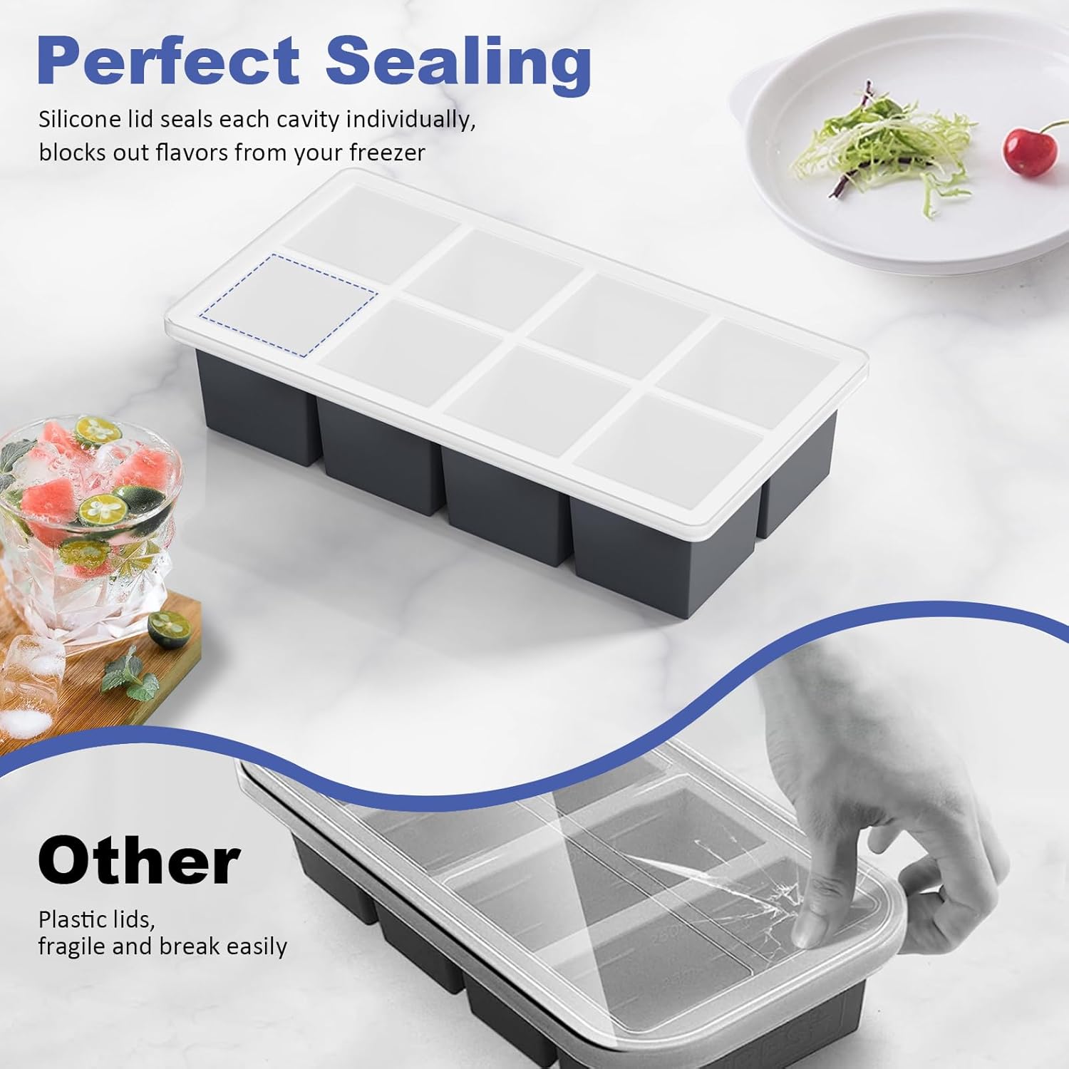 - UPGRADE LARGE SILICONE ICE CUBE TRAY: The upgrade bottom of big ice cube tray has individual compartments which make it easy to remove 1 ice cube at a time. The top lid snapped tightly and stays sealed to prevent spilling, keep ice fresh and eliminate freezer odors.