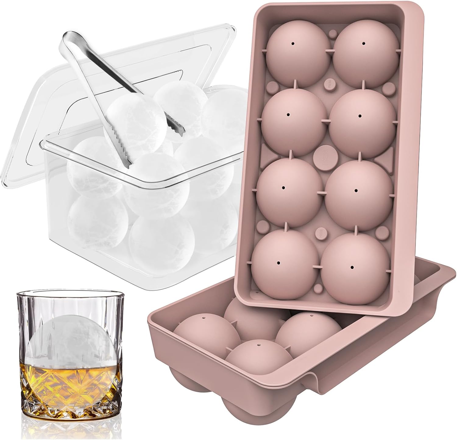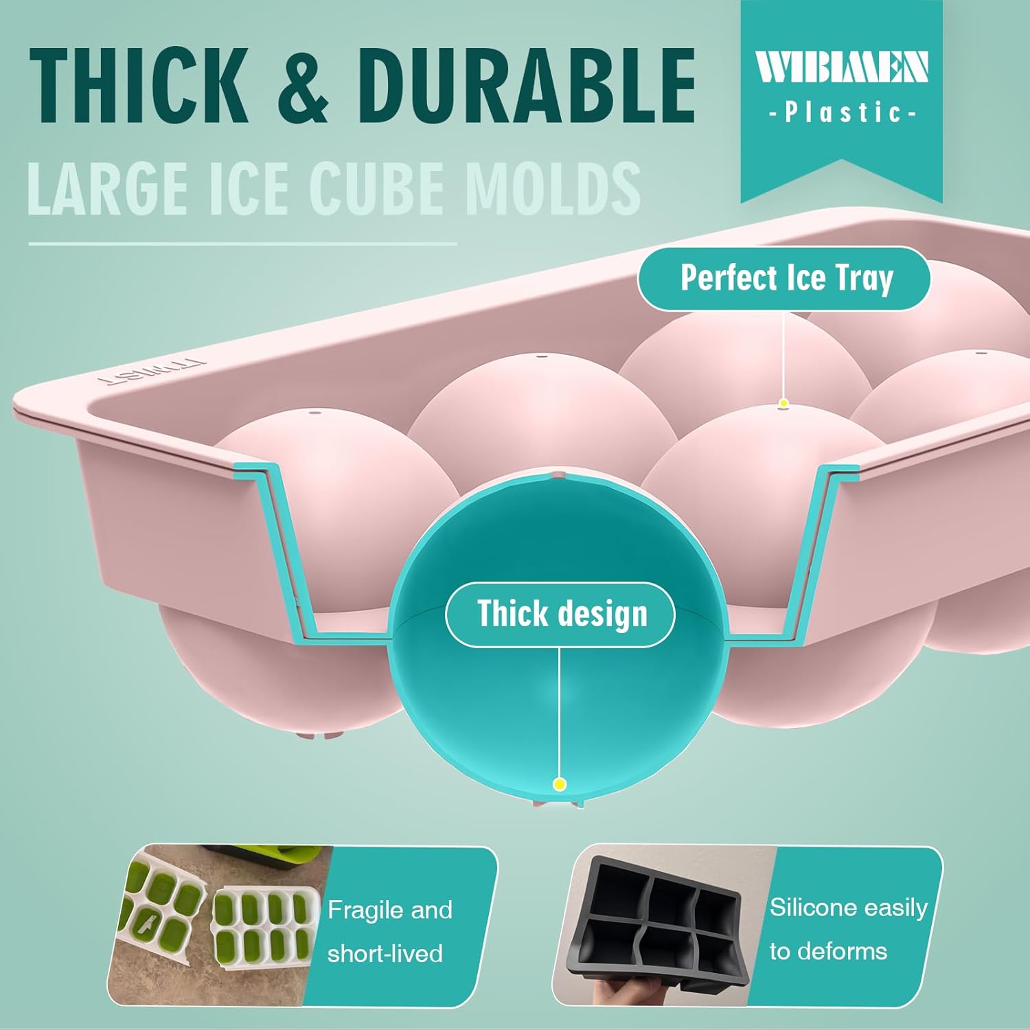 WIBIMEN Large Ice Cube Molds, Big Round Whiskey Ice Cube Trays for Freezer, Easy to Fill & Release, Whiskey Bourbon Cocktail(2.5In*8 Balls- Pink/2 Pack)