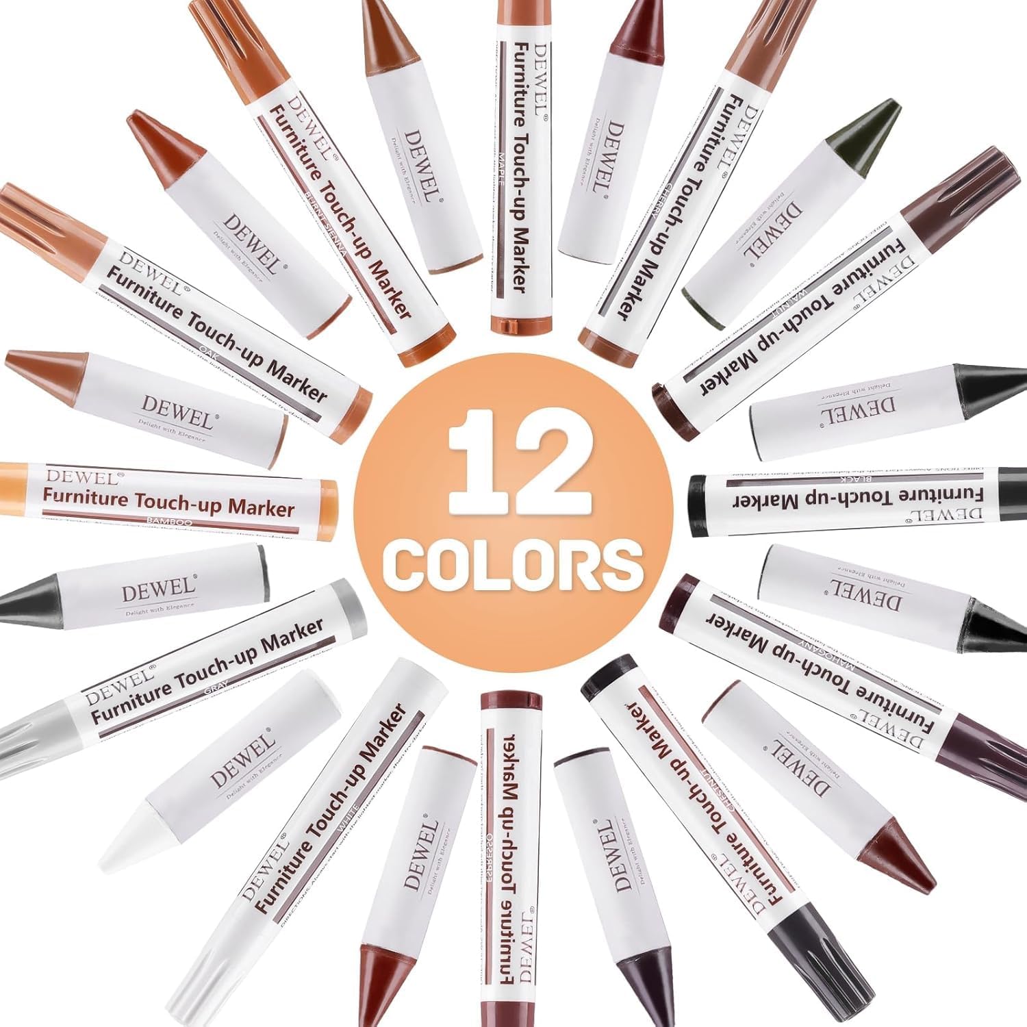 DEWEL Wood Furniture Markers & Filler Sticks Repair Kit, New Improved 12 Colors Touch Up Markers and Crayons - Covering Damaged Wooden Surfaces and Floors, for Pets Scratches, Stains, Cracks and Dents