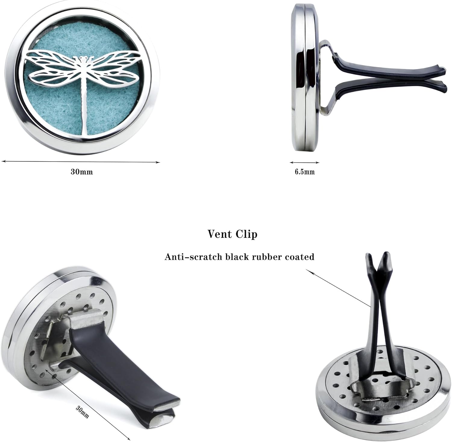 - 【Material 】high quality 316L stainless steel 30mm Car Diffuser Vent Clip, solid and smooth, anti-corrosion, easy to clean, we pair our diffuser car vent with reusable 10 color refill pads. Complete with a solid back and two magnets for a secure close, you’ll never have to worry about getting essential Oil all over your car.