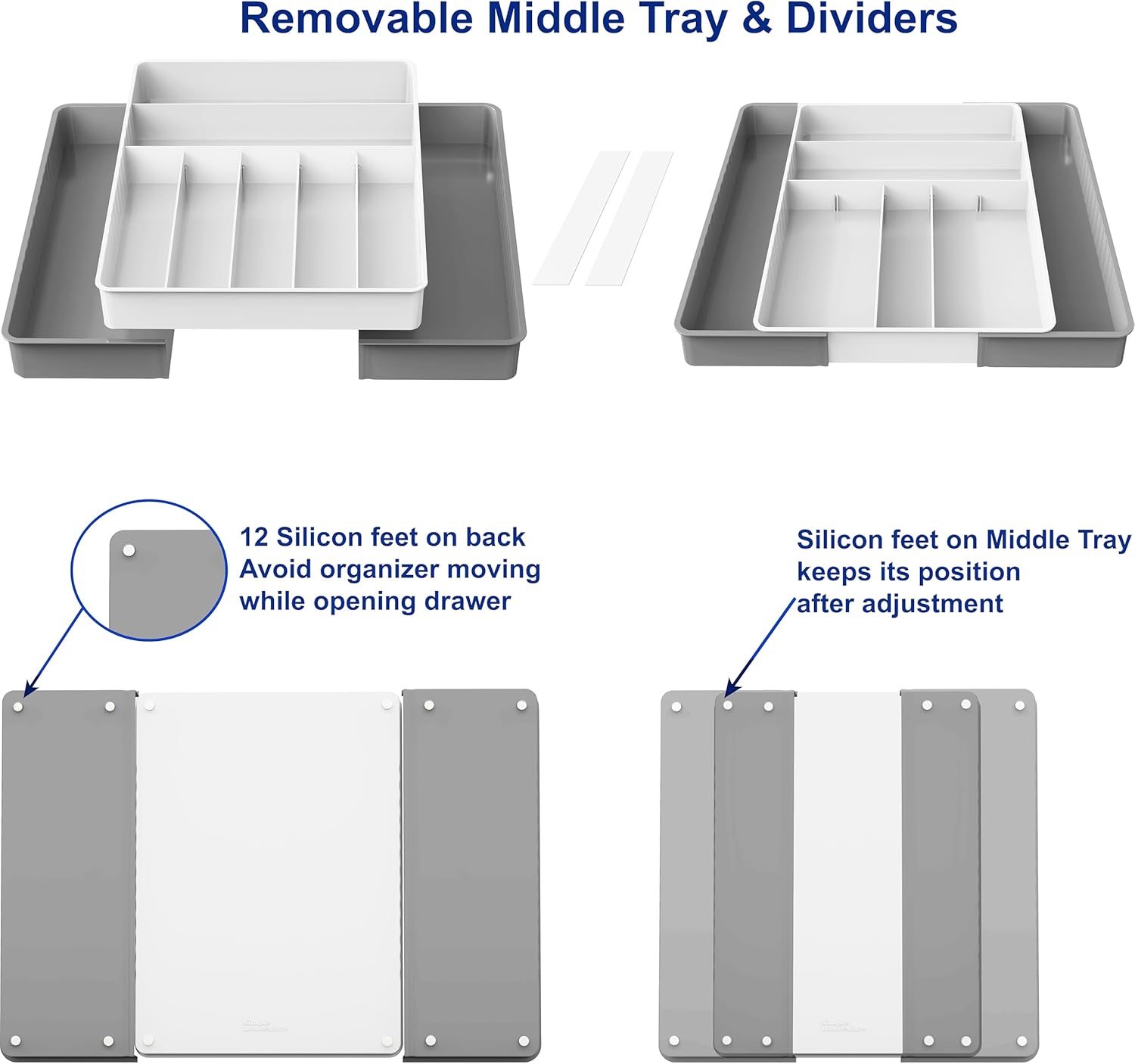 - Removable middle tray allows this organizer transform into 3 pieces. Thus it can be used in 3 different size of drawers