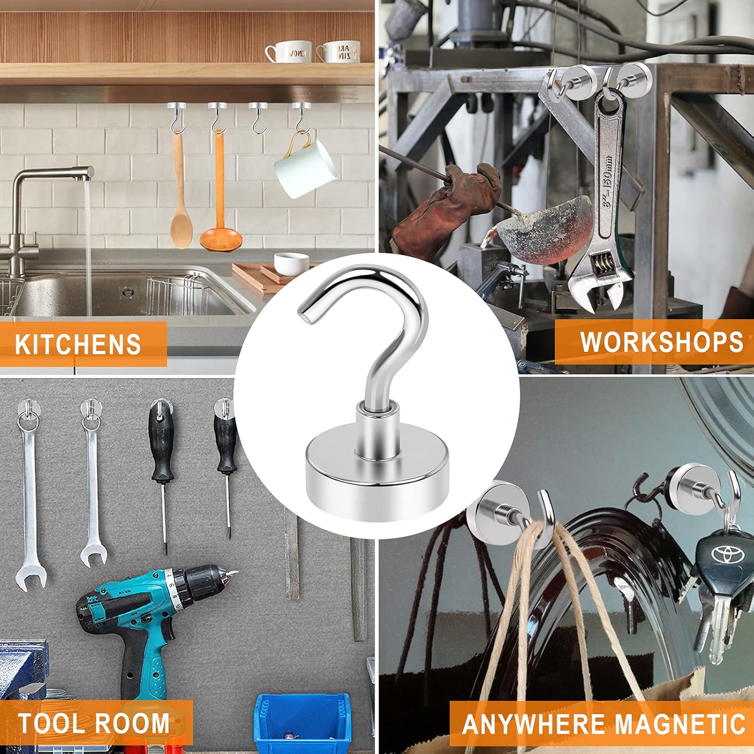 - 【Excellent layer Coating】- Our metal magnetic hooks come with an excellent triple-layer coating of Ni+Cu+Ni, which greatly reinforces their corrosion resistance. This coating is the best available, providing a shiny and rust-resistant surface that helps prevent chipping or cracking. The coated steel cup also provides protection for the heavy duty magnetic refrigerator hooks. With this excellent layer coating, you can trust that our magnetic hanging hooks are safe to use and will last a long time