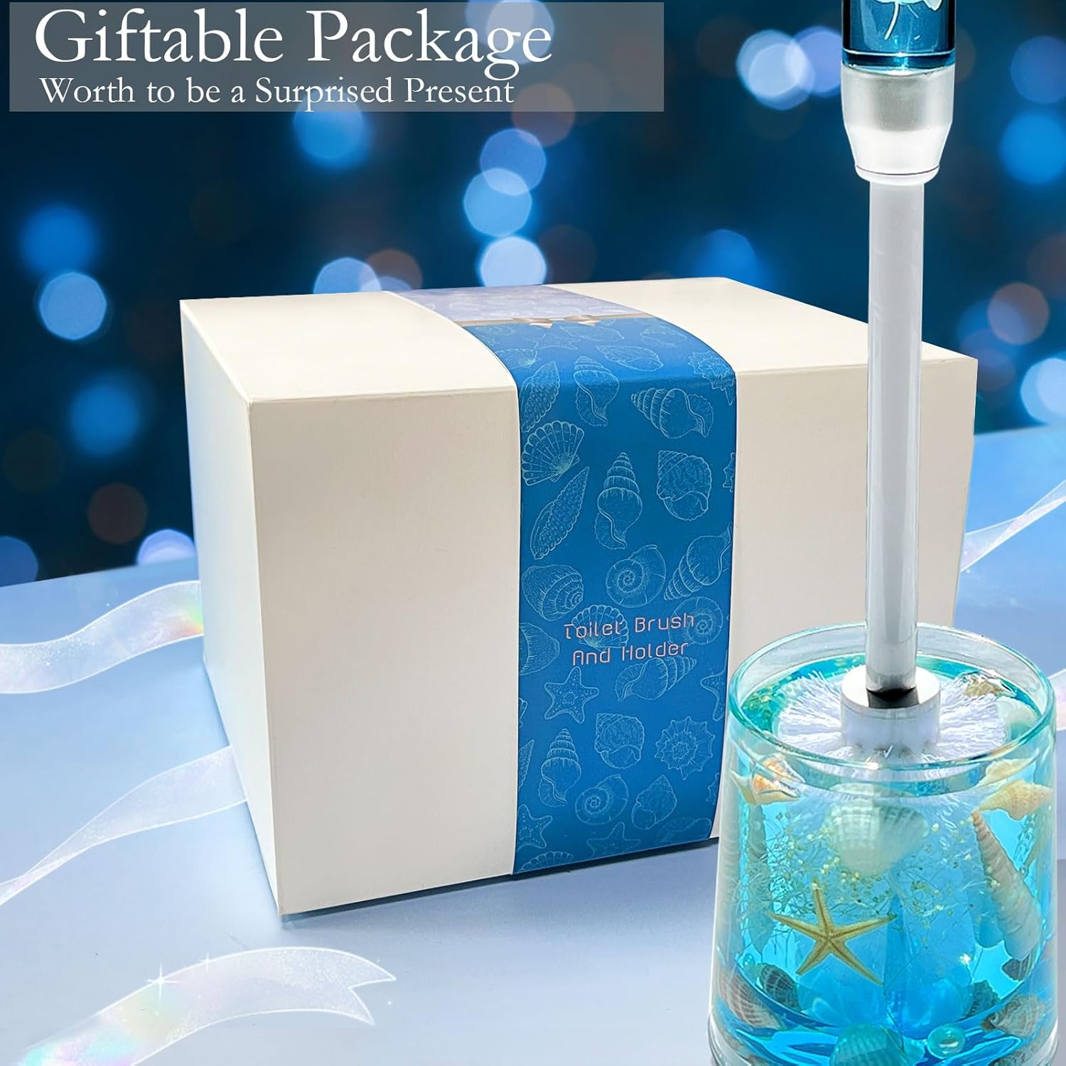 FONMY Toilet Brush and Holder Acrylic with Nature Seashell,Compact Size Toilet Bowl Brush with Plastic Handle Easy to Hide, Drip-Proof,Space Saving for Storage,Easy to Assemble,Deep Cleaning, (Blue)