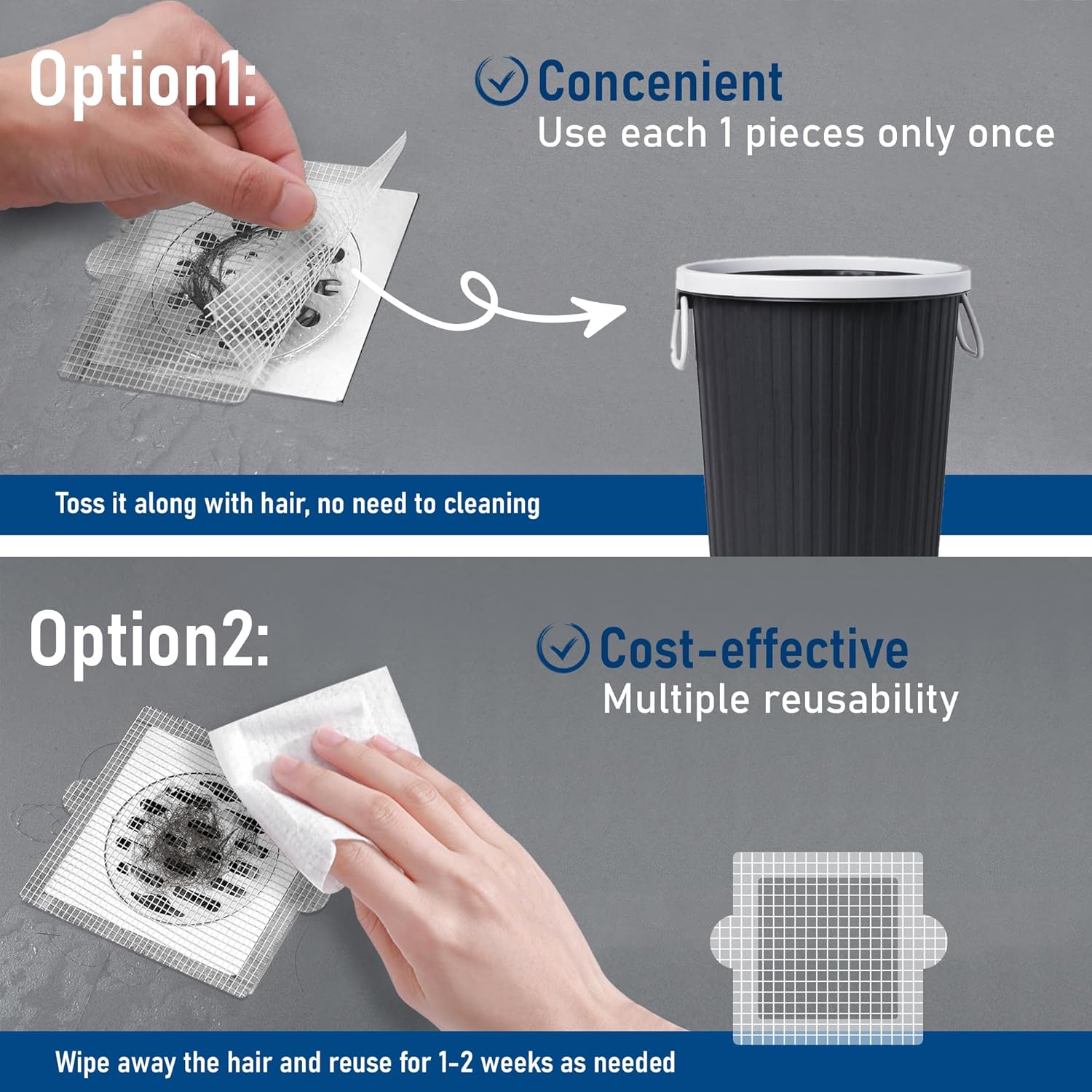 - 【Caution】: Before using a disposable drain hair catcher, pls make sure the shower drain surface is completely dry and clean, otherwise the drain hair catcher will move around with the water flow.