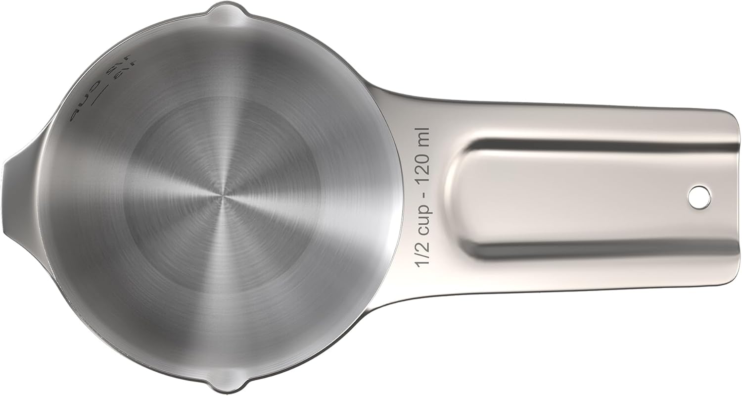 - Accurate ½ Cup Measuring Cup (Chrome Finish) with Embossed Markings – Features permanent, easy-to-read embossing for ½-cup (½ taza), ⅓-cup (⅓ taza), and 120 ml. Dual US and metric measurements won’t fade, scratch, or wear off.