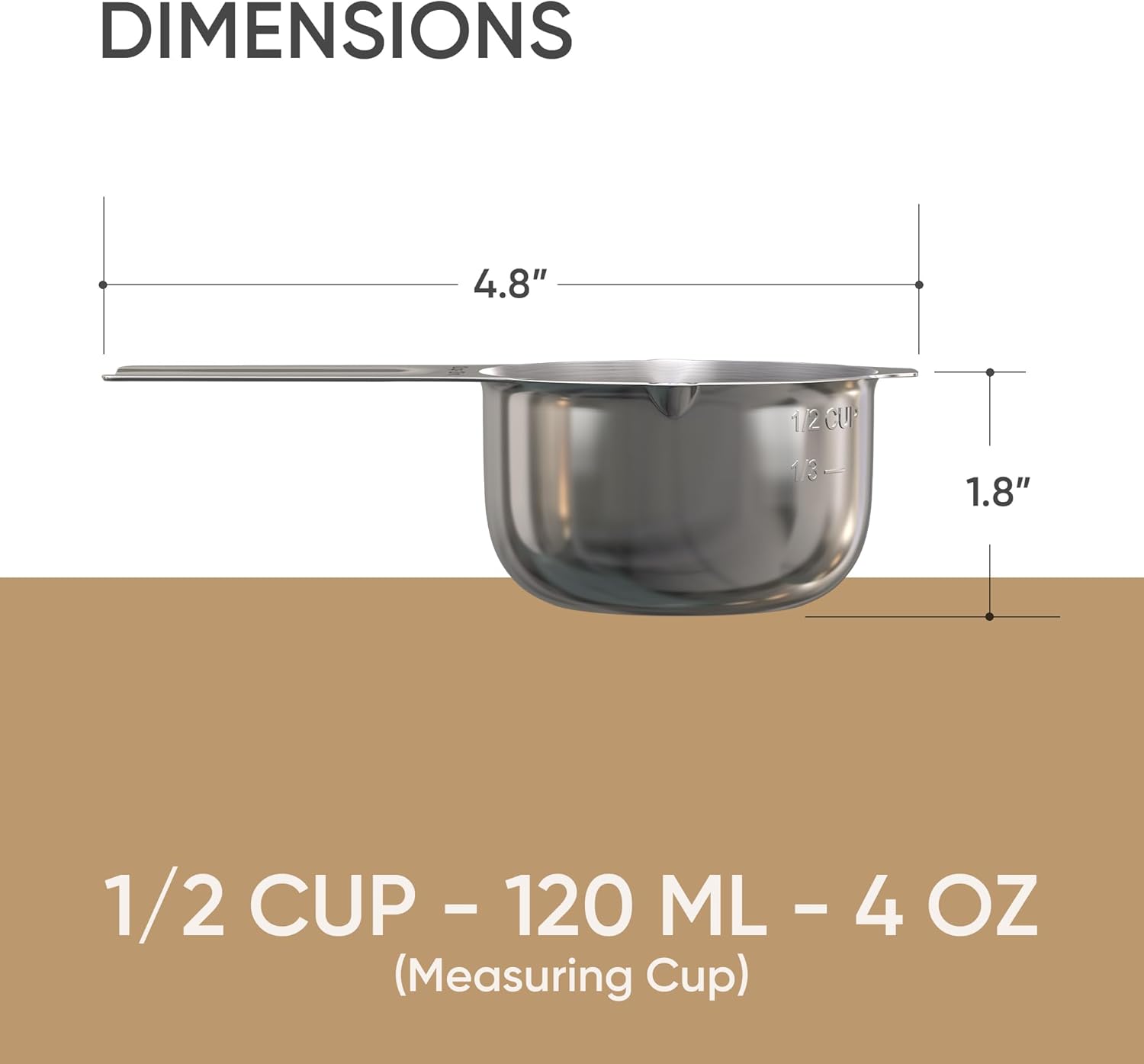 - Premium ½ Cup Stainless Steel Measuring Cup – Chef Quality – Made from rust-resistant 304 food-grade stainless steel. BPA-free, odor-resistant, and sturdier than plastic or glass alternatives.
