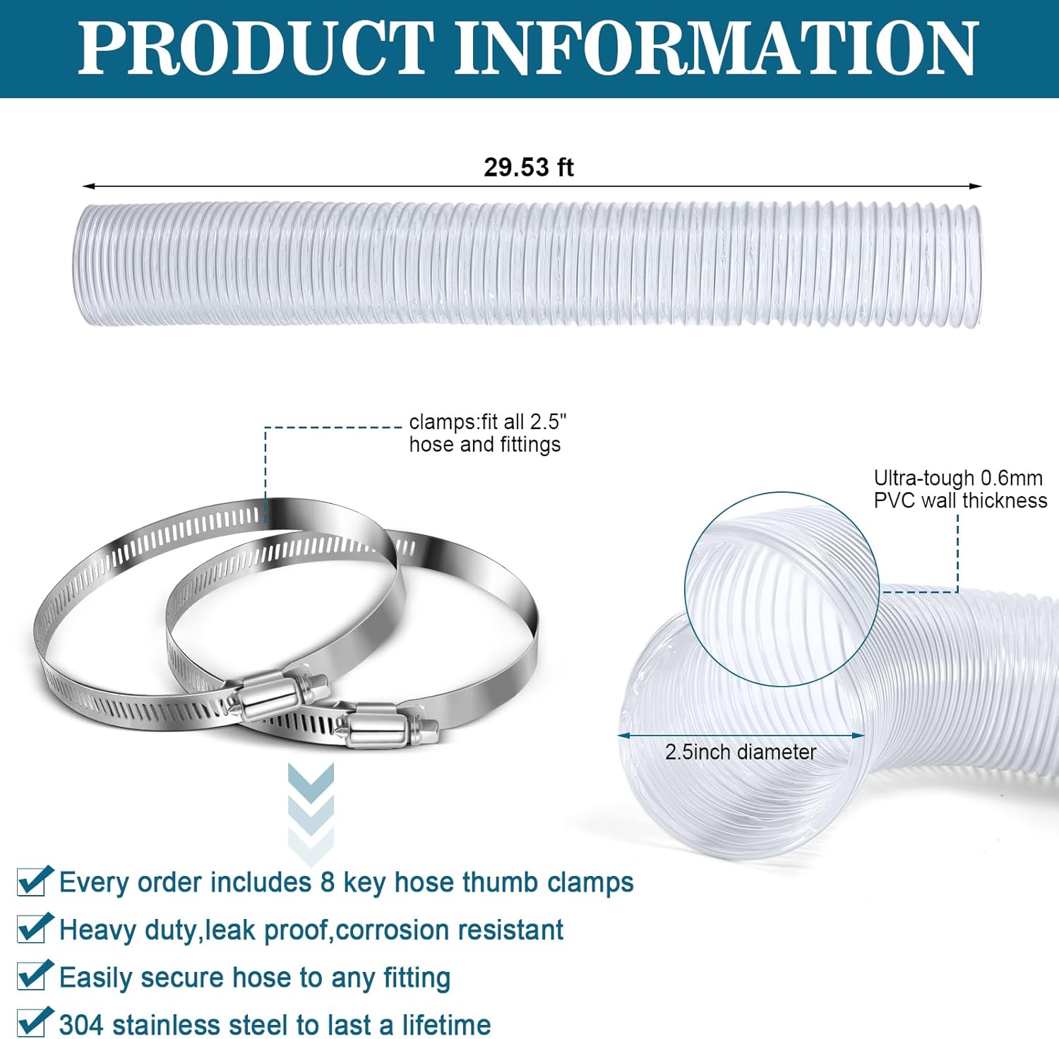 2.5 inches 30 ft PVC Dust Collection Hose with Stainless Steel Clamps Set Flexible Clear Vacuum Puncture Resistant Fume Hose for Vacuums Cleaner Fume Dust Collection System