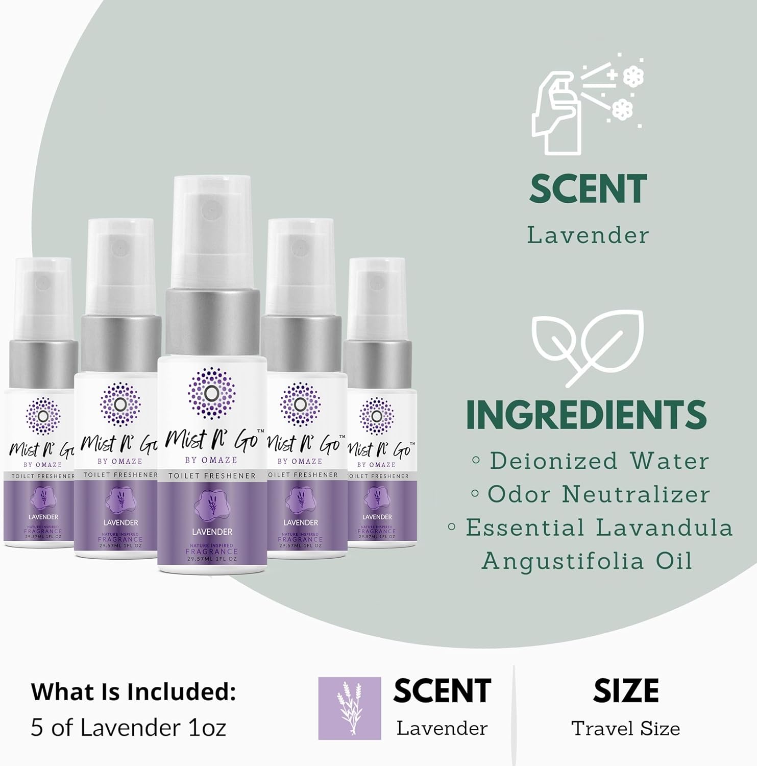 Mist N’ Go by Omaze Travel Bathroom Spray for Toilet Spray Odor Eliminator - Travel Toilet Spray for Bathroom Air Freshener Spray for Bathroom Deodorizer - Lavender Travel Size (1oz x5)