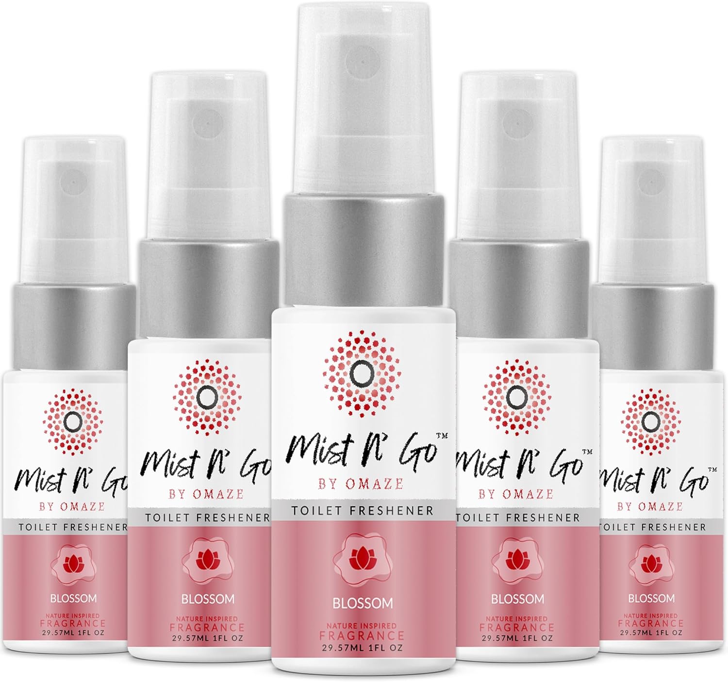 Mist N’ Go by Omaze Travel Bathroom Spray for Toilet Spray Odor Eliminator - Travel Toilet Spray for Bathroom Air Freshener Spray for Bathroom Deodorizer - Blossom Travel Size (1oz x5)