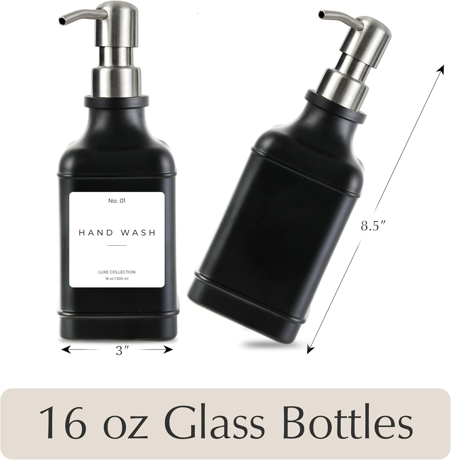 - β PREMIUM QUALITY THAT LASTS: Designed to complement any space, these 16 oz glass soap dispensers are perfect for hand soap, dish soap, lotion, or shampoo. Ideal for sinks in your kitchen, bathroom, laundry room, or guest bath. Unlike dispensers that peel or break down, our bottles are made from thick, durable glass that resists wear and looks elegant on any countertop.