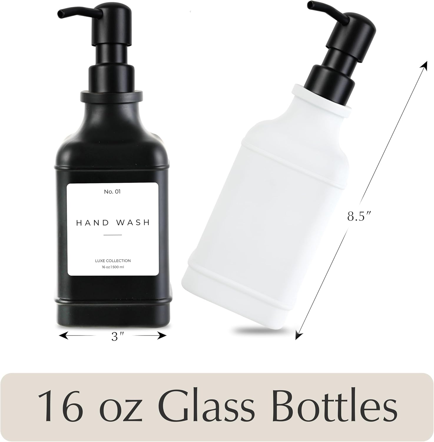 - β PREMIUM QUALITY THAT LASTS: Designed to complement any space, these 16 oz glass soap dispensers are perfect for hand soap, dish soap, lotion, or shampoo. Ideal for sinks in your kitchen, bathroom, laundry room, or guest bath. Unlike dispensers that peel or break down, our bottles are made from thick, durable glass that resists wear and looks elegant on any countertop.