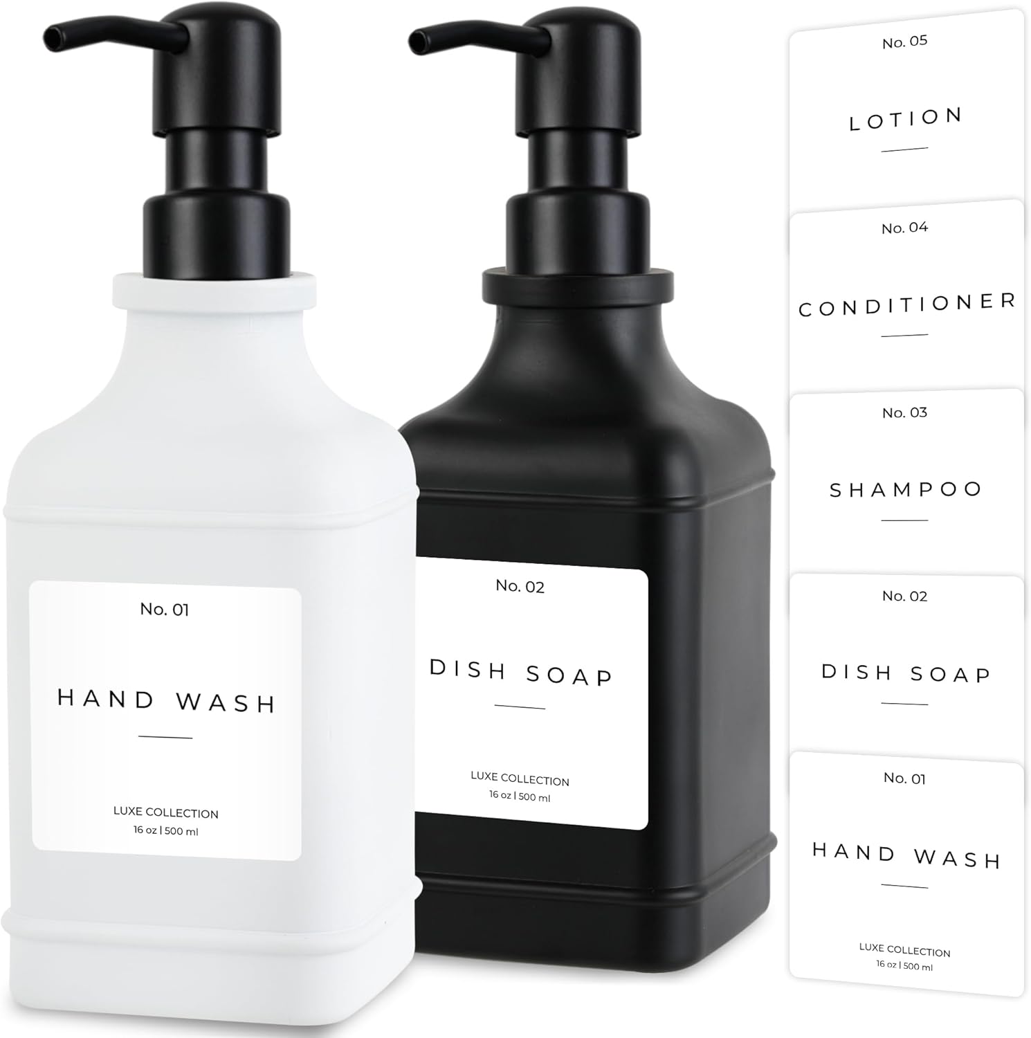 - β 5 WATERPROOF LABELS: Now with 5 stickers, it's your choice to use the Kitchen Soap Dispenser Set with Dish Soap for hand soap, dish wash, lotion, conditioner, or shampoo. To clean the lotion dispenser set for the bathroom and kitchen sink soap dispenser set, just run the bottle under water and watch any residue simply wash off. With our exclusive no-leak pump, the bottle enables you to put out a good amount of soap with a single pump.